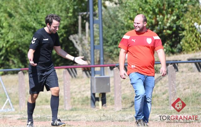 War nach dem Spiel zum Scherzen aufgelegt: Frank Hohmann (links) im Zwiegespräch mit Mackenzells Trainer Thomas Baier. Foto: Johannes Götze