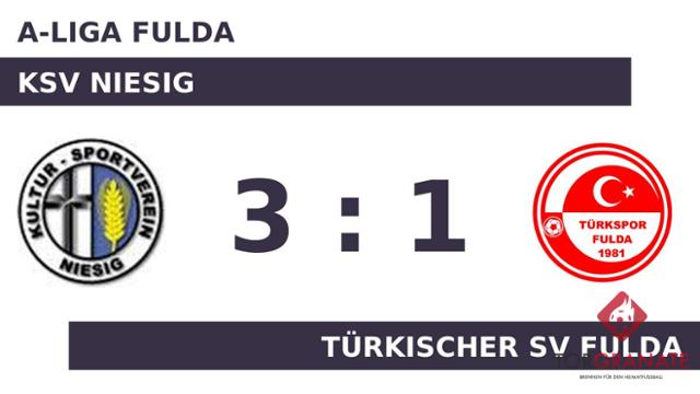 Dennis Broschke brachte den Türkischer SV per Doppelschlag ins Hintertreffen, als er in der 13. und 31. Minute vollstreckte. In der 15. Minute stellten die Fuldaer personell um: Per Doppelwechsel kamen Emre Bayrak und Ali Sharif auf den Platz und ersetzten Sudaysi Abdi Hussein und Gökhan Aydogan. Nach nur 25 Minuten verließ Ali Kocak von den Türken das Feld, Dawit Tekie Abraham kam in die Partie. Mit der Führung für den KSV Niesig ging es in die Halbzeitpause. Die gute Ausgangslage für den zweiten Durchgang nutzte der KSV zum Wechseln: Lucas Laibach spielte fortan für Marcel Rudolf weiter. Mit dem 3:0 durch Sebastian Neu schien die Partie bereits in der 50. Minute mit dem Kultur-Sportverein einen sicheren Sieger zu haben. Für das 1:3 des Türkischer SV Fulda zeichnete Hueseyin Disli verantwortlich (73.). Am Schluss schlug der KSV Niesig die Gäste mit 3:1.