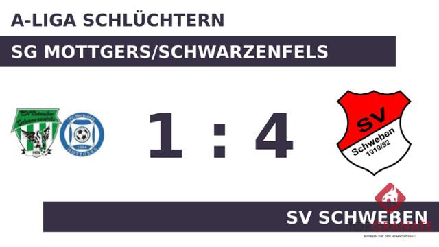 Eine Aussage darüber, wer am Ende die Nase vorn haben würde, war nach dem Abpfiff der ersten Halbzeit noch nicht zu treffen. Es ging mit einem Gleichstand in die Kabinen. Für das erste Tor sorgte Carsten Stey. In der 46. Minute traf der Spieler des SV Schweben ins Schwarze. Beim SVS gab es ein neues Gesicht auf dem Platz: Dennis Sorg wurde für Louis Auth eingewechselt. Nach der Pause ging das Spiel ohne Sören Steffentorweihen weiter, dafür stand nun Tristan Zeller bei Mottgers/Schwarzenf. auf dem Feld. Sorg erhöhte für den SV Schweben auf 2:0 (48.). Mit dem 3:0 von Florian Storch für die Schwebener war das Spiel eigentlich schon entschieden (53.). Für das 4:0 des Gasts sorgte Finn Henkel, der in Minute 83 zur Stelle war. Die SG Mottgers/Schwarzenfels kam kurz vor dem Ende durch Julius Kirchner zum Ehrentreffer (88.). Schließlich sprang für den SV Schweben gegen Mottgers/Schwarzenf. ein Dreier heraus.