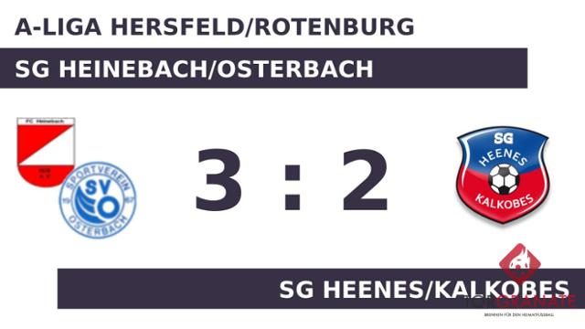 Szabolcs Szaraz brachte Heinebach/Osterbach in der zwölften Minute in Front. Das 1:1 von Heenes/Kalkobes stellte Selim Ünal sicher (30.). Bis zum Abpfiff des ersten Durchgangs wurden keine Tore mehr geschossen und so traten die Mannschaften den Gang in die Kabinen an. Patrick Lenort witterte seine Chance und schoss den Ball zum 2:1 für die SG Heinebach/Osterbach ein (60.). Marvin Jakob versenkte den Ball in der 74. Minute im Netz des Gastgebers. Gefeierter Mann des Spiels war Szaraz, der Heinebach/Osterbach mit seinem Treffer in der 86. Minute den Vorsprung brachte. Am Ende verbuchte die SG Heinebach/Osterbach gegen die SG Heenes/Kalkobes einen Sieg.
