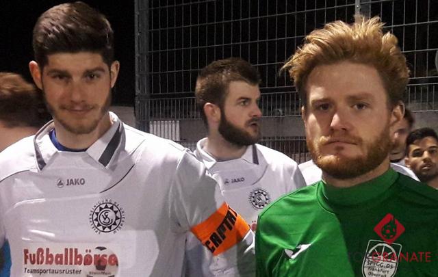 Die beiden Kapitäne Lars Jung (links, Griesheim) und George Worcester (rechts, Oberrad) posieren vor dem Anpfiff. Foto: Pedro Acebes