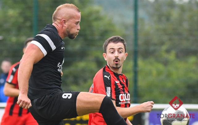 Denis Erovic (schwarz, hier gegen den Hosenfelder Andre Gajic) wird auch in der Spielzeit 2021/22 Trainer des SV Müs sein. Foto: Kevin Kremer