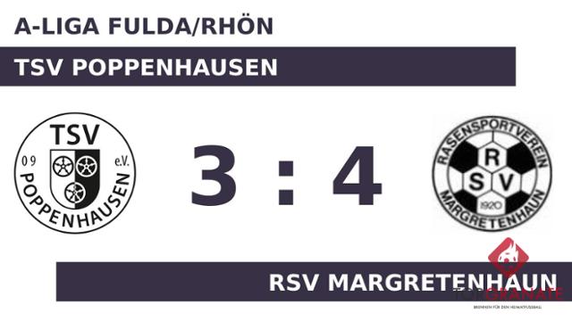Das erste Tor des Spiels ging an den RSV. Allerdings gelang dies nur mithilfe des TSV Poppenhausen: 1:0 für den RSV Margretenhaun durch ein Eigentor in der 16. Minute. Claudius Jestaedt war es, der in der 27. Minute den Ball im Gehäuse des RSV Margretenhaun unterbrachte. Kurz vor der Pause traf Gaith Akrama für die Hünsche (45.). Die Margretenhauner hatten zur Pause eine knappe Führung auf dem Zettel stehen. Der Rasensportverein stellte in der Pause personell um: Jonas Fröhlich ersetzte Sören Huder eins zu eins. Der TSV Poppenhausen kam mit einer geänderten Formation aus der Kabine zurück: Asadullah Rahmatyar war für Tobias Beier zur Stelle. In der 47. Minute erhöhte Felix Bug auf 3:1 für den RSV Margretenhaun. Nosayaba Enehikhare traf zum 2:3 zugunsten des TSV Poppenhausen (50.). Dominik Hintze verwandelte in der 65. Minute einen Elfmeter und baute den Vorsprung des RSV Margretenhaun auf 4:2 aus. Mit einem Elfmeter von Louis Schrehardt kam der TSV Poppenhausen noch einmal ran (68.). In den 90 Minuten war der RSV Margretenhaun im gegnerischen Strafraum erfolgreicher als der TSV Poppenhausen und fuhr somit einen 4:3-Sieg ein.