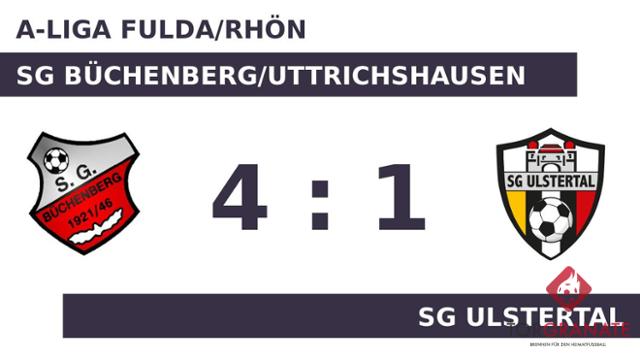 Manuel Schreib brachte die SG Büchenberg/Uttrichshausen in der 20. Minute in Front. Mit einem schnellen Doppelpack (35./37.) zum 3:0 schockte Benjamin Röhrig die SG Ulstertal. Kurz vor dem Seitenwechsel legte Zirap Alija das 4:0 nach (40.). Nach dem souveränen Auftreten der Büchenb./Uttrichsh. überraschte es kaum einen Zuschauer, dass zur Pause eine deutliche Führung stand. Morro Jammeh erzielte in der 60. Minute den Ehrentreffer für die SG Ulstertal. Bei der SG Büchenberg/Uttrichshausen ging in der 63. Minute der etatmäßige Keeper Leon Winges raus, für ihn kam Benjamin Vogler. Obwohl der SGBU nach erfolgreicher erster Hälfte keine weiteren Tore gelangen, schaffte es die SG Ulstertal zugleich nicht, die Partie zu drehen. Sie endete mit 4:1.