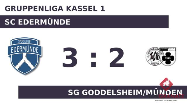 Für den Führungstreffer des Gasts zeichnete Benedikt Schweitzer verantwortlich (16.). Die passende Antwort hatte Jonathan Mertsch parat, als er in der 19. Minute zum Ausgleich traf. Das letzte Tor der turbulenten Startphase markierte Nico Langhans in der 22. Minute. Ohne weitere Tore ging es in die Pause. Wenig später kamen Steffen Koch und Maximilian Just per Doppelwechsel für Rico Waidner und Alexander Einwächter auf Seiten des SC Edermünde ins Match (60.). Sven Reppert, der von der Bank für Nils Pletzinger kam, sollte für neue Impulse bei der SG Goddelsheim/Münden sorgen (71.). Reppert traf zum 2:2 zugunsten von Goddelsheim/Münden (75.). Gefeierter Mann des Spiels war Mertsch, der dem SC Edermünde mit seinem Treffer in der 90. Minute den Vorsprung brachte. Letztlich nahm das Heimteam gegen den direkten Abstiegskonkurrenten wichtige Punkte mit und trug einen Sieg davon.