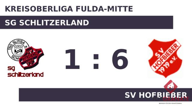 Yannik Bleuel brachte den SV in der 25. Minute nach vorn. Die SG Schlitzerland war gewillt auszugleichen. Bis zum Seitenwechsel sprang jedoch nichts Zählbares mehr heraus. Alexander Scholz erhöhte für den SV Hofbieber auf 2:0 (47.). Für das 3:0 der Hofbieberer sorgte Fabio Ruppert, der in Minute 61 zur Stelle war. Die SG Schlitzerland verkürzte den Rückstand in der 67. Minute durch einen Elfmeter von Johannes Heil auf 1:3. Niklas Schuhmann (76.), Bleuel (78.) und Tarik Faber (87.) ließen im weiteren Verlauf keine Zweifel am Sieg des SV Hofbieber aufkommen. Der Tabellenprimus überrannte die SG Schlitzerland förmlich mit sechs Toren und fährt so mit einem verdienten Sieg in der Tasche nach Hause.