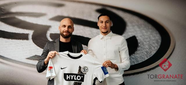 Der Angreifer des FC Gießen, Younes Ebnoutalib (rechts), geht bei der SV Elversberg um Sportvorstand Ole Book den nächsten Karriereschritt. © SV Elversberg