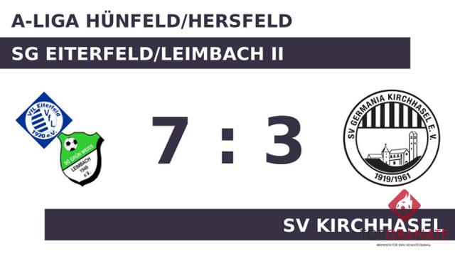 Alexander Busold brachte den SV Kirchhasel in der 15. Minute ins Hintertreffen. Doppelpack für die SG Eiterfeld/Leimbach II: Nach seinem ersten Tor (20.) markierte Luca Pfalzgraf wenig später seinen zweiten Treffer (26.). Während einige mit ihren Gedanken bereits in der Pause waren, nutzte Thomas Vogt seine Chance und schoss das 1:3 (45.) für den SV Kirchhasel. Mit der Führung für Eiterf./Leimbach II ging es in die Halbzeitpause. Mit dem 4:1 von Levi Koeller für die Spielgemeinschaft war das Spiel eigentlich schon entschieden (51.). Mit dem zweiten Treffer von Vogt rückte der SV Kirchhasel wieder ein wenig an die SG Eiterfeld/Leimbach II heran (52.). Eiterf./Leimbach II baute die Führung aus, indem Busold zwei Treffer nachlegte (61./69.). Sebastian Vogt verkürzte für den SV Kirchhasel später in der 82. Minute auf 3:6. Ehe der Abpfiff ertönte, war es Benny Wolf, der das 7:3 aus Sicht der SG Eiterfeld/Leimbach II perfekt machte (90.). Zum Schluss feierte Eiterf./Leimbach II einen dreifachen Punktgewinn gegen den SV Kirchhasel.