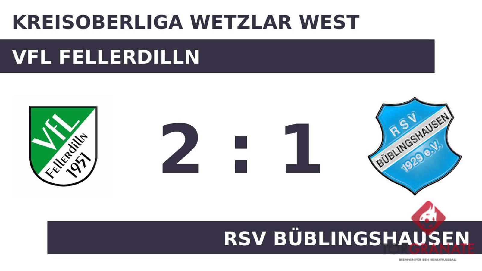 Mit einem schnellen Doppelpack (39./42.) zum 2:0 schockte Kim Dylus das Büblingshausen. Mit der Führung für den VfL Fellerdilln ging es in die Kabine. Wenig später kamen Dominik Häusser und Benny Witt per Doppelwechsel für Faruk Bulutlar und Michael Krumm auf Seiten des Gastgebers ins Match (66.). Kurz vor Ultimo war noch Christopher Reuling zur Stelle und zeichnete für das erste Tor des RSV Büblingshausen verantwortlich (90.). Obwohl dem VfL Fellerdilln nach erfolgreicher erster Hälfte keine weiteren Tore gelangen, schaffte es das Büblingshausen zugleich nicht, die Partie zu drehen. Sie endete mit 2:1.