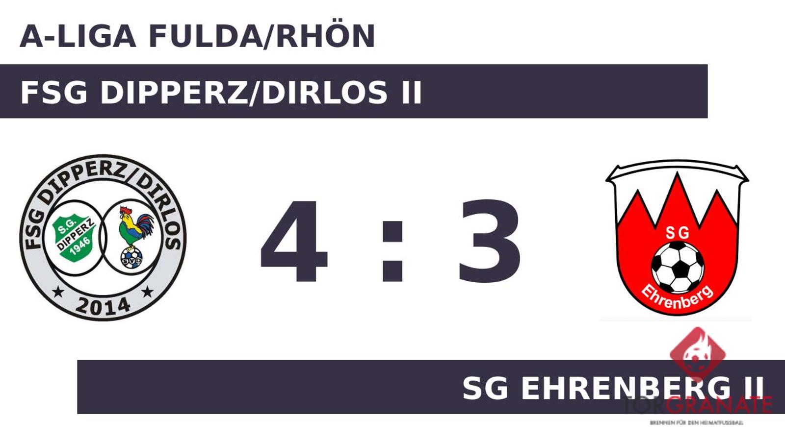 Die FSG Dipperz/Dirlos II erwischte einen Blitzstart ins Spiel. Lucas Herzog traf in der fünften Minute zur frühen Führung. Nach nur 22 Minuten verließ Linus Keidel von der SG Ehrenberg II das Feld, Christopher Gürtler kam in die Partie. Patrick Schmitt schoss für die SG in der 23. Minute das erste Tor. Julius Reutter machte in der 34. Minute das 2:1 der Ehrenberger perfekt. Zur Pause behielten die Rhöner die Nase knapp vorn. In der 48. Minute erzielte Sebastian Burkart das 2:2 für die FSG DiDi II. Per Elfmeter erhöhte Herzog in der 72. Minute seine Torausbeute an diesem Tag auf zwei Treffer – 3:2 für die FSG. Mit dem 3:4 gelang Schmitt ein Doppelpack – an der Niederlage änderte dies jedoch auch nichts mehr (89.). Letzten Endes ging die FSG Dipperz/Dirlos II im Duell mit der SG Ehrenberg II als Sieger hervor.