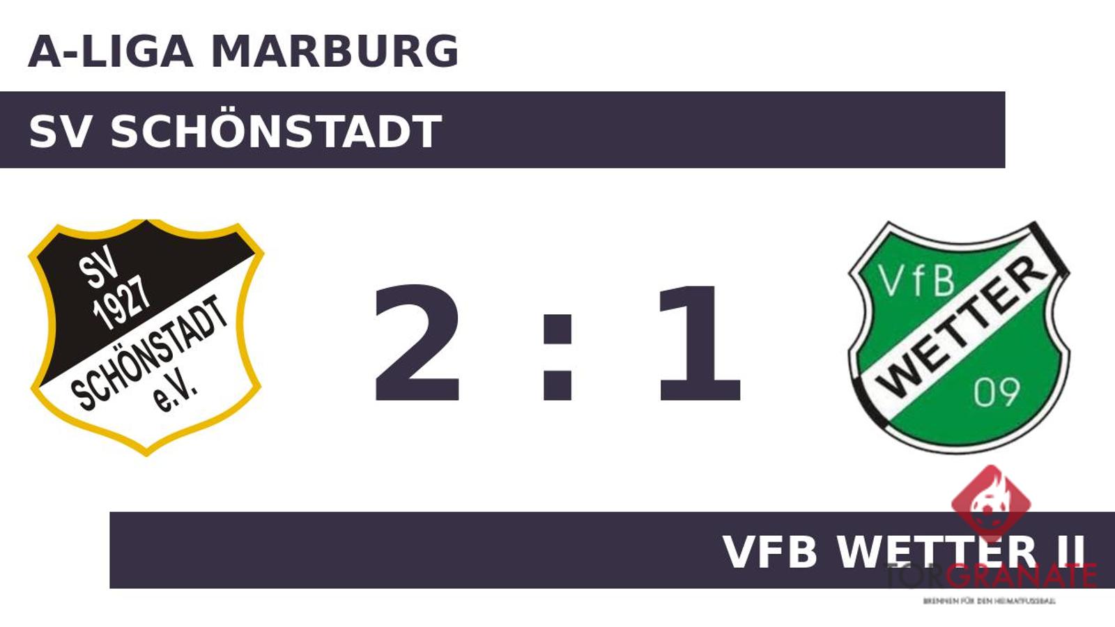 Maximilian Schüler stellte die Weichen für den SV Schönstadt auf Sieg, als er in Minute 25 mit dem 1:0 zur Stelle war. Bis zur Pause fiel kein weiteres Tor, sodass das Ergebnis noch Bestand hatte, als sich die Teams in die Pause verabschiedeten. Für das 1:1 des VfB Wetter II zeichnete Joel Boesser verantwortlich (48.). Die spielentscheidende Rolle nahm Morten Roeser ein, der kurz vor knapp für den SV Schönstadt zum Führungstreffer bereitstand (90.). Schließlich sprang für das Heimteam gegen den VfB Wetter II ein Dreier heraus.