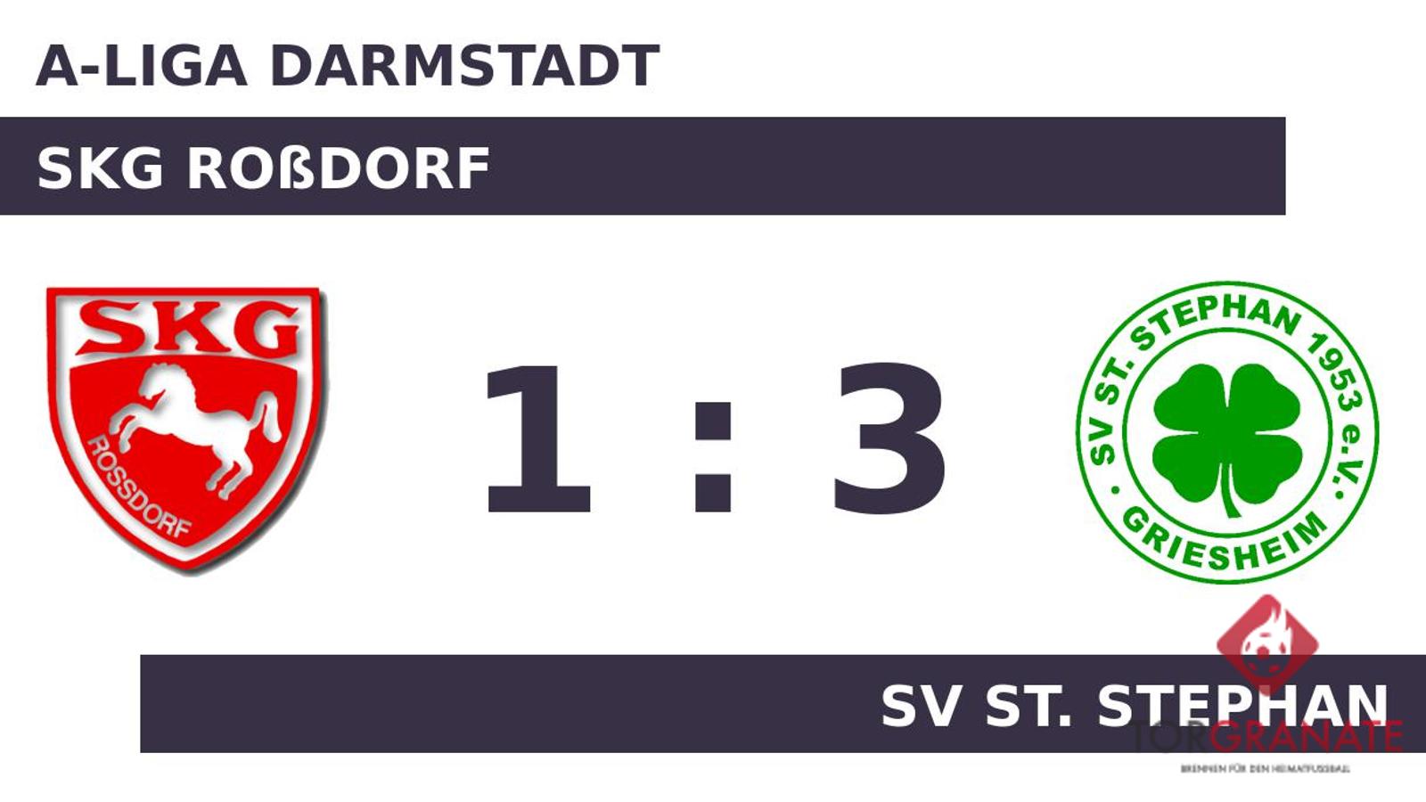 Hilal Zoubaa brachte sein Team in der 15. Minute nach vorn. Die SKG Roßdorf bejubelte noch das letzte Erfolgserlebnis, als Francesco Torino für den Ausgleich sorgte (21.). Das letzte Tor der turbulenten Startphase markierte Philipp Root in der 26. Minute. Zur Pause reklamierte der SV St. Stephan eine knappe Führung für sich. Beim Gast kam zu Beginn der zweiten Hälfte Kevin Witt für Jan Zimmermann in die Partie. In der 48. Minute brachte Kevin Vetter das Netz für den SV St. Stephan zum Zappeln. Mit dem Schlusspfiff durch den Schiedsrichter siegte der SV St. Stephan gegen die SKG Roßdorf.