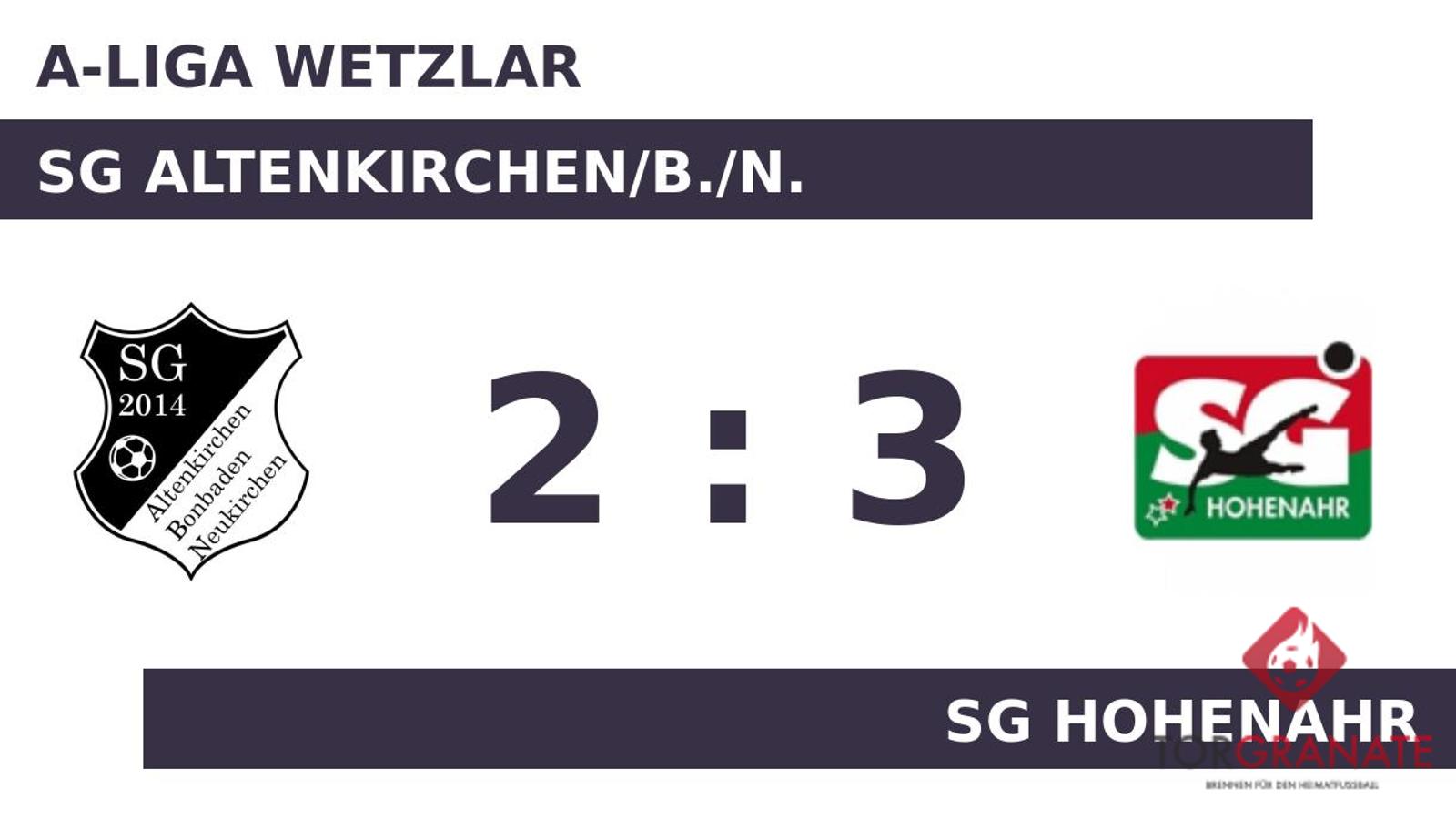 Kaum war das Spiel angepfiffen, lag die SG Hohenahr bereits in Front. Steffen Jordan markierte in der dritten Minute die Führung. Kilian Ruehl beförderte das Leder zum 2:0 der SG Hohenahr über die Linie (24.). Bis zur Pause fiel kein weiteres Tor, sodass das Ergebnis noch Bestand hatte, als sich die Teams in die Pause verabschiedeten. In der 53. Minute legte Jordan zum 3:0 zugunsten der SG Hohenahr nach. Janik Donges verkürzte für die SG Altenkirchen/B./N. später in der 65. Minute auf 1:3. Kurz vor Ultimo war noch Manuel Doenges zur Stelle und zeichnete für das zweite Tor des Heimteams verantwortlich (89.). Nachdem das Altenk./Bonb./Neuk. zunächst völlig von der Rolle gewesen war, zog es sich am Ende zumindest noch achtbar aus der Affäre. Zu einem Punktgewinn reichte es jedoch nicht mehr.