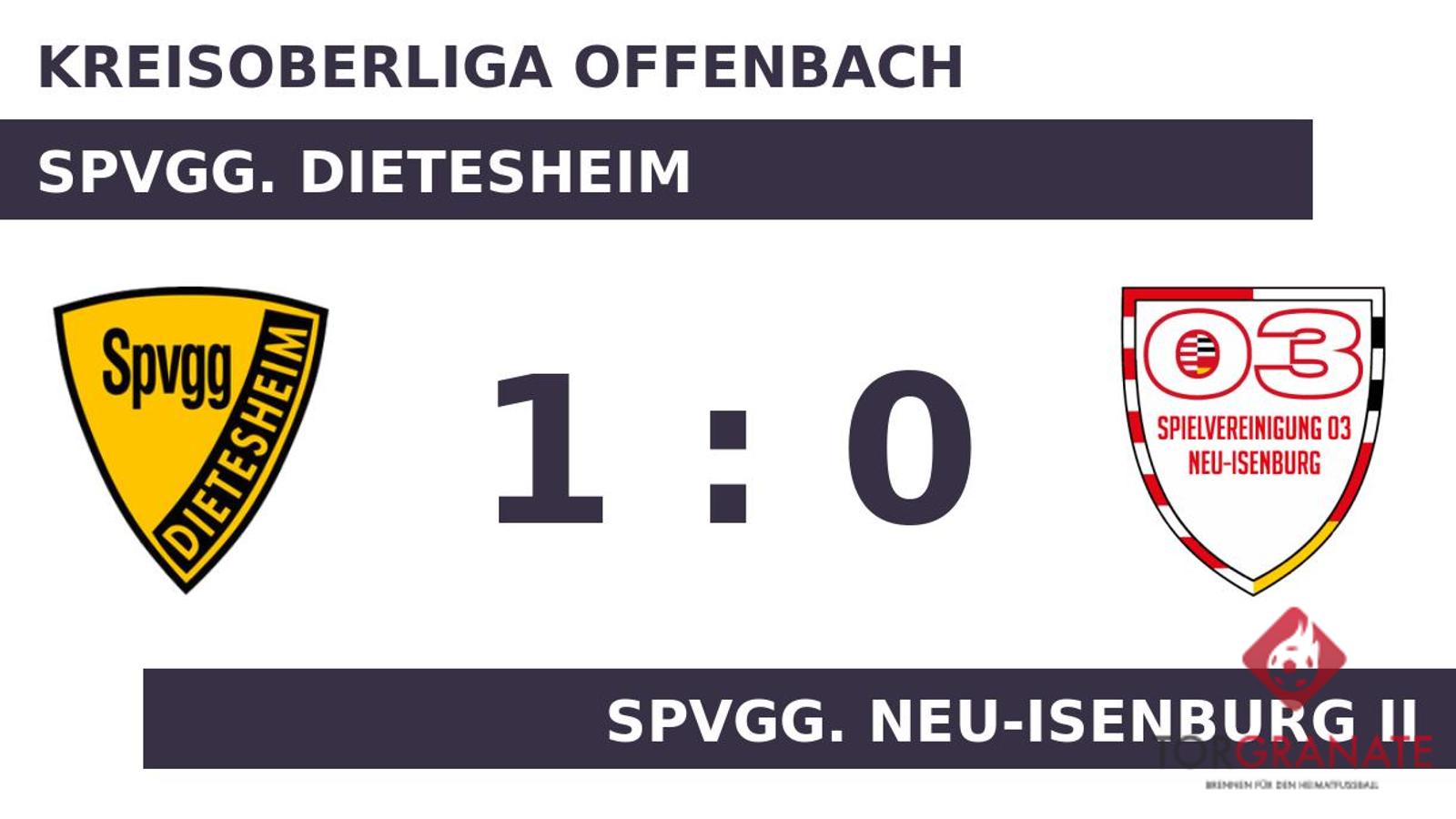 Nach den ersten 45 Minuten ging es für die Dietesheimer und die Spvgg. Neu-Isenb. II ohne Torerfolg in die Kabinen. Atilla Manav brachte die Spvgg. Neu-Isenburg II in der 54. Minute ins Hintertreffen. Nach Beendigung der zweiten Halbzeit hieß das Ergebnis 1:0 zugunsten der Spvgg. Dietesheim.