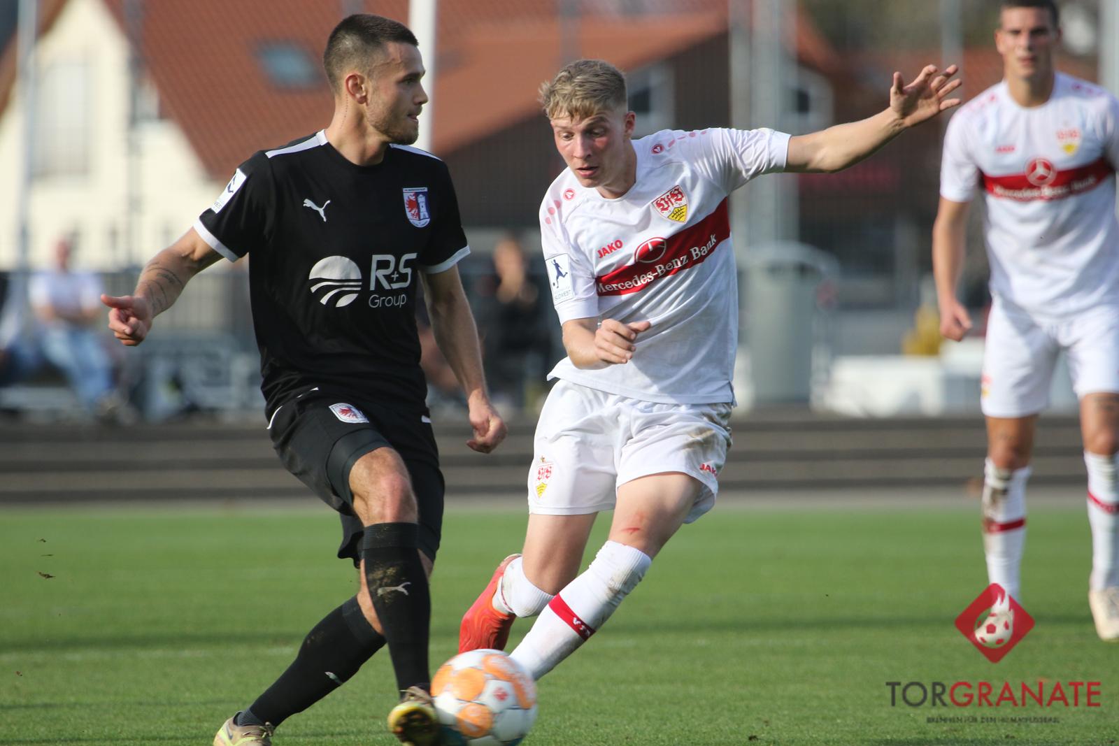 Zuvor hatte die U21 des VfB Stuttgart vier Spiele lang nicht getroffen – und dann dauerte es gegen die SGB keine zehn Minuten bis zum Erfolgserlebnis. Mit der Stuttgarter Formation mit Dreierkette kam die SG Barockstadt in der Anfangsphase überhaupt nicht zurecht, so dass der rechte Schienenspieler Julian Kudala leicht in den Strafraum einziehen und sein Pendant Mattis Hoppe in der Mitte bedienen konnte (9.). Zuvor hatte bereits Jannis Boziaris frei vor Tobias Wolf die Chance zur frühen Führung (2.).