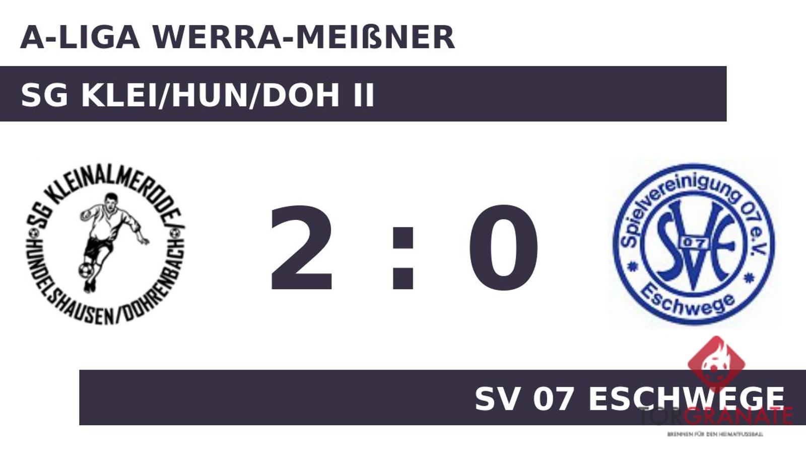 Im ersten Durchgang tasteten sich die beiden Mannschaften lediglich ab, Tore gab es nicht zu verzeichnen. Bei der SG Klei/Hun/Doh II kam zu Beginn der zweiten Hälfte Dominik Weiss für Leon Gries in die Partie. Kevin Träbing brach für den Gastgeber den Bann und markierte in der 82. Minute die Führung. Ehe der Abpfiff ertönte, war es Tim Demus, der das 2:0 aus Sicht des Spitzenreiters perfekt machte (89.). Schließlich sprang für die SG Klei/Hun/Doh II gegen die SV 07 Eschwege ein Dreier heraus.