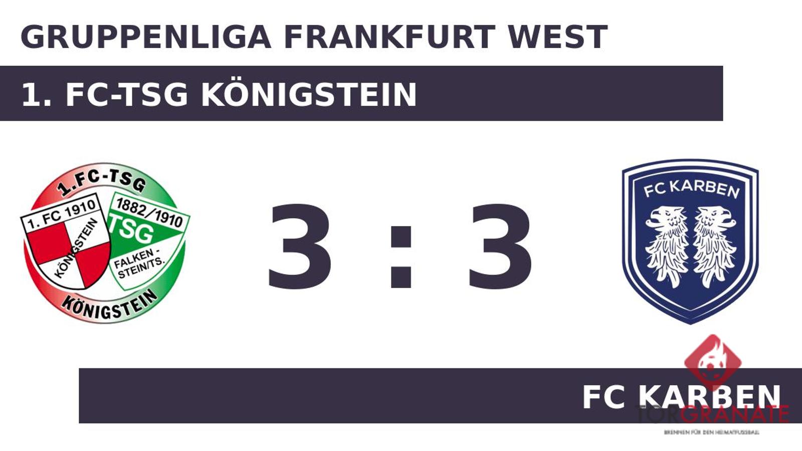 Nico Grill machte in der 19. Minute das 1:0 des 1. FC-TSG Königstein perfekt. In der 30. Minute erzielte Tim Brunotte Martinez das 1:1 für den FC Karben. Kurz vor dem Seitenwechsel legte Luca Hannig das 2:1 nach (42.). Die Pausenführung des FC Karben fiel knapp aus. Mit dem Tor zum 3:1 steuerte Hannig bereits seinen zweiten Treffer an diesem Tag bei (47.). Es folgte der Anschlusstreffer für den 1. FC-TSG Königstein – bereits der zweite für Grill. Nun stand es nur noch 2:3 (55.). Für den Gleichstand, der kurz vor dem Ende zustande kam, zeichnete Zino Zampach mit seinem Treffer aus der 90. Minute verantwortlich. Am Ende stand es zwischen dem 1. FC-TSG Königstein und dem FC Karben pari.