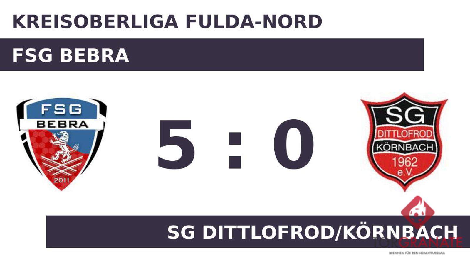Romeo Onetiu stellte die Weichen für die FSG Bebra auf Sieg, als er in Minute zwölf mit dem 1:0 zur Stelle war. Für Loris Baumgart war der Einsatz nach zwölf Minuten vorbei. Für ihn wurde Artan Ramadani eingewechselt. Nach nur 26 Minuten verließ Ole Kellner von der FSG Bebra das Feld, Thomas Eisel kam in die Partie. Zur Pause war die FSG im Fahrwasser und verbuchte eine knappe Führung. In der 46. Minute brachte Manuel Schmidt den Ball im Netz der SG Dittlofrod/Körnbach unter. Den Vorsprung der FSG Bebra ließ Niklas Holzhauer in der 53. Minute anwachsen. In der 72. Minute legte Schmidt zum 4:0 zugunsten der Bebraer nach. Jan Luca Fischer gelang in den Schlussminuten noch ein weiterer Treffer für die Spielgemeinschaft (85.). Am Ende kam die FSG Bebra gegen Dittlofrod/Körnbach zu einem verdienten Sieg.