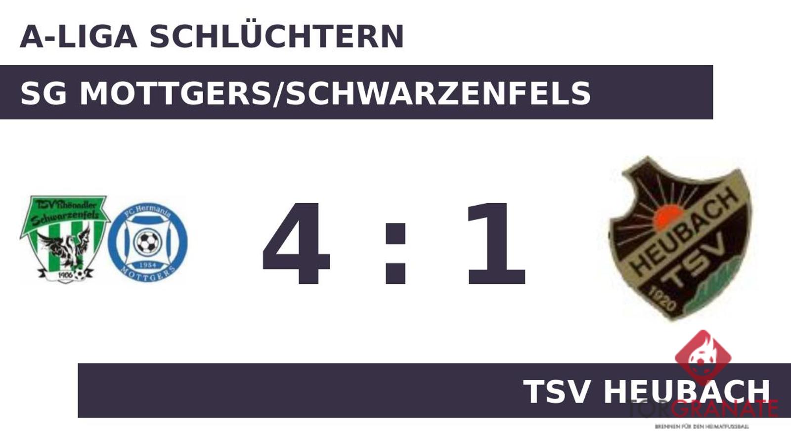 Kaum war das Spiel angepfiffen, lag die SG bereits in Front. Joshua Schaefer markierte in der fünften Minute die Führung. Kurz vor dem Halbzeitpfiff (45.) baute Robin Andres die Führung der Spielgemeinschaft aus. Mit der Führung für das Heimteam ging es in die Halbzeitpause. Andres gelang ein Doppelpack (70./75.), mit dem er das Ergebnis auf 4:0 hochschraubte. Der TSV Heubach kam kurz vor dem Ende durch Lars Helmer zum Ehrentreffer (86.). Schlussendlich verbuchte Mottgers/Schwarzenf. gegen den TSV einen überzeugenden Heimerfolg.