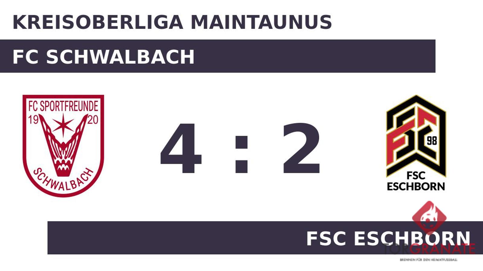 Kaum war das Spiel angepfiffen, lag der FC Schwalbach bereits in Front. Erfan Zebarjadi markierte in der fünften Minute die Führung. Wenig später verwandelte Giuseppe Tedesco einen Elfmeter zum 2:0 zugunsten des FC Schwalbach (43.). Mit der Führung für den FC Schwalbach ging es in die Halbzeitpause. Mit dem 3:0 durch Ayoub Laghmari schien die Partie bereits in der 50. Minute mit dem FC Schwalbach einen sicheren Sieger zu haben. Der FSC Eschborn verkürzte den Rückstand in der 60. Minute durch einen Elfmeter von Tomislav Zecevic auf 1:3. Für das 4:1 des FC Schwalbach sorgte Tedesco, der in Minute 71 zur Stelle war. Für das 2:4 des FSC Eschborn zeichnete Rian Bachiri verantwortlich (90.). Schlussendlich verbuchte der FC Schwalbach gegen die Gäste einen überzeugenden Heimerfolg.