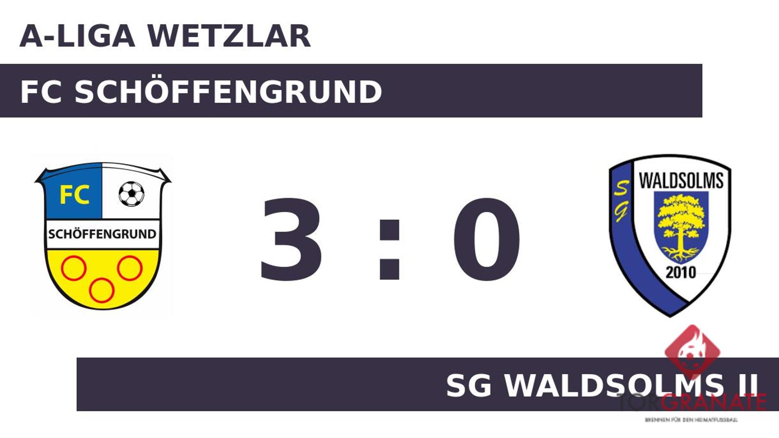 Christian Boettner schoss in der dritten Minute vom Elfmeterpunkt das erste Tor des Spiels für den FC Schöffengrund. Ohne dass sich am Stand noch etwas tat, schickte der Unparteiische Vojin Vuletic (Königstein im Taunus) die Akteure in die Pause. In der 87. Minute erhöhte Sebastian Chmura auf 2:0 für den FC Schöffengrund. Den Vorsprung der Gastgeber ließ Luke Hellmich in der 90. Minute anwachsen. Letztlich hat die SG Waldsolms II den Befreiungsschlag klar verpasst. Gegen den direkten Widersacher um den Klassenverbleib, den FC Schöffengrund, bekam man das Fell über die Ohren gezogen.