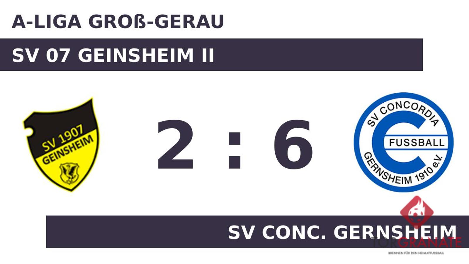 Pascal Sattler glänzte an diesem Tag besonders. Er traf im Doppelpack für den SV Conc. Gernsheim (12./32.). Während einige mit ihren Gedanken bereits in der Pause waren, nutzte Max Meier seine Chance und schoss das 3:0 (42.) für den SV Conc. Gernsheim. Zur Halbzeit blickte der SV Conc. Gernsheim auf einen klaren Vorsprung gegen einen Gegner, den man deutlich beherrschte. Sascha Demel (46.) und Meier (52.) brachten den SV Conc. Gernsheim mit zwei schnellen Treffern weiter nach vorne. In der Halbzeit nahm der SV 07 Geinsheim II gleich zwei Wechsel vor. Fortan standen Elias Hahn und Andreas Bauer für Maximilian Losert und Kim Ginkel auf dem Platz. Der SV Conc. Gernsheim musste den Treffer von Hahn zum 1:5 hinnehmen (61.). Wenig später kamen Mürsel Atac und Nick Leyenaar per Doppelwechsel für Hasan Erkek und Sattler auf Seiten des SV Conc. Gernsheim ins Match (64.). Meier überwand den gegnerischen Schlussmann zum 6:1 für den SV Conc. Gernsheim (82.). Hahn verkürzte für den SV 07 Geinsheim II später in der 90. Minute auf 2:6. Ein starker Auftritt ermöglichte dem SV Conc. Gernsheim am Sonntag einen ungefährdeten Erfolg gegen den SV 07 Geinsheim II.