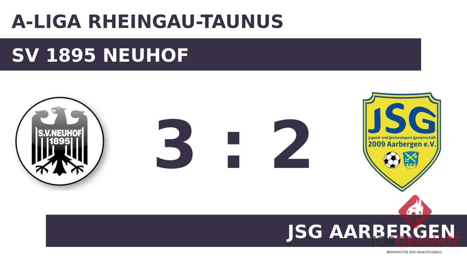 Für Daniel Pickhardt war der Einsatz nach zwei Minuten vorbei. Für ihn wurde Radovan Djukovic eingewechselt. Maximilian Dicks brachte den Ball zum 1:0 zugunsten der SV Neuhof über die Linie (29.). Für das 2:0 des Heimteams zeichnete Tim David Beerenwinkel verantwortlich (31.). Djukovic nutzte die Chance für die JSG Aarbergen und beförderte in der 35. Minute das Leder zum 1:2 ins Netz. Zur Pause behielt die SV 1895 Neuhof die Nase knapp vorn. Zum Seitenwechsel ersetzte Marvin Vogl von der JSG Aarbergen seinen Teamkameraden Andreas Weyl. Vincent Volb erhöhte für die SV Neuhof auf 3:1 (49.). Sebastian Henn ließ sich in der 88. Minute nicht zweimal bitten und verwertete zum 2:3 für die JSG Aarbergen. Am Schluss gewann die SV 1895 Neuhof gegen den Gast.