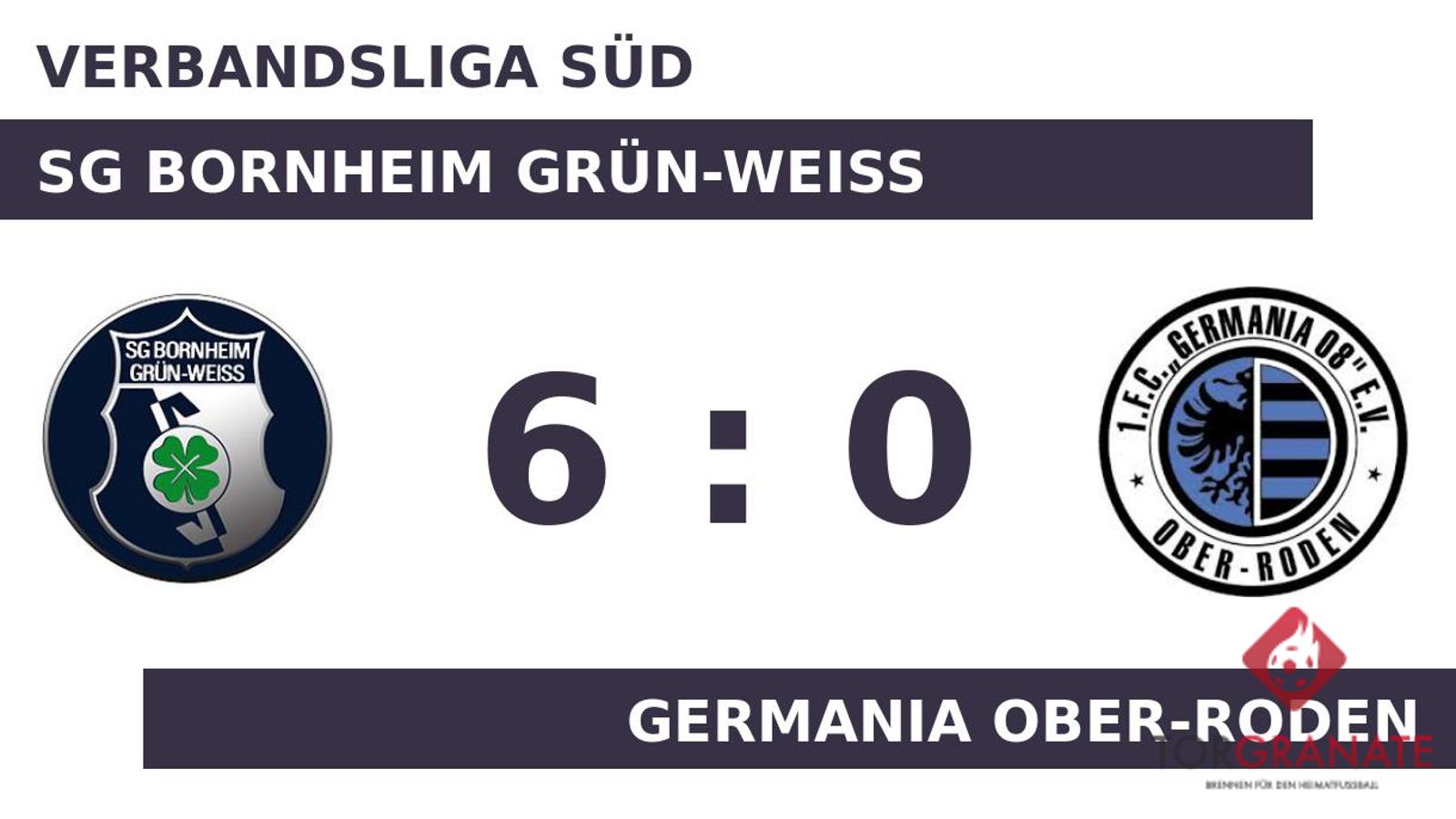 In der 16. Minute fiel der Führungstreffer für die SG Bornheim per Eigentor. Kurz vor dem Halbzeitpfiff (45.) baute Nick Wehrheim die Führung der Grün-Weissen aus. Mit der Führung für die Bornheimer ging es in die Halbzeitpause. Germania Ober-Roden wehrte sich mit allen Mitteln gegen die drohende Niederlage und wechselte mit Marco Christophori-Como einen weiteren nominellen Stürmer für Anosh Kapoor ein. In der Pause stellte die SG Bornheim Grün-Weiss personell um: Per Doppelwechsel kamen Niklas Troll und Raphael Ahmed Gure auf den Platz und ersetzten Benny Christian Lafortune und Min Jae Kim. Mit dem 3:0 von Lukas Knell für die Gastgeber war das Spiel eigentlich schon entschieden (54.). Mit dem 4:0 durch Wehrheim schien die Partie bereits in der 57. Minute mit der SG Bornheim einen sicheren Sieger zu haben. Germania Ober-Roden nahm in der 58. Minute einen Wechsel zweier etatmäßiger Verteidiger vor, als Sascha Ries für Fabian Geyer vom Platz ging. Gure legte in der 70. Minute zum 5:0 für die SG Bornheim Grün-Weiss nach. Knell war es, der kurz vor Ultimo das 6:0 besorgte und die SG Bornheim inklusive Anhang damit von höheren Gefilden träumen lässt (90.). Am Ende kam die SG Bornheim Grün-Weiss gegen Germania Ober-Roden zu einem verdienten Sieg.
