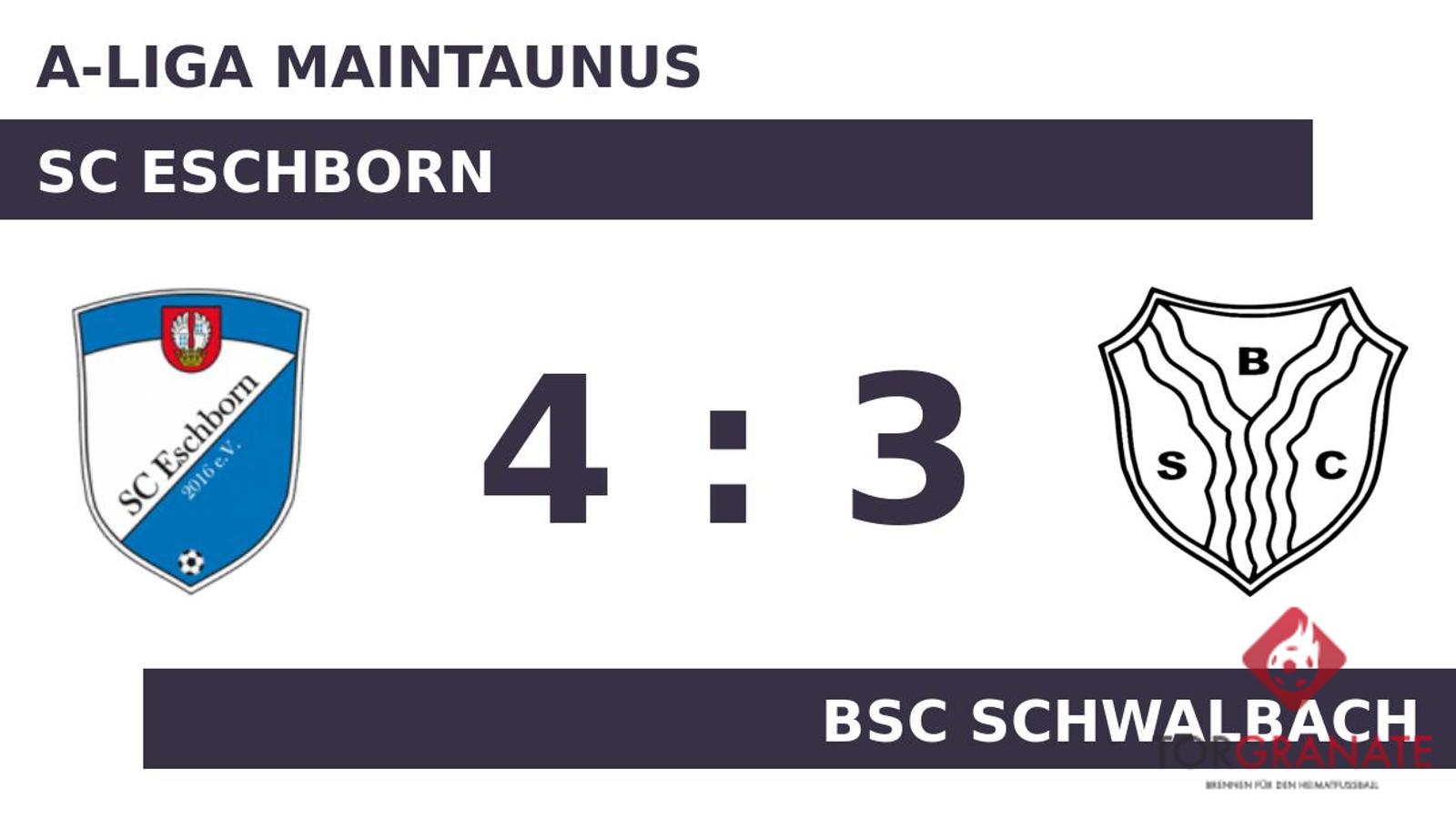 Der Gast erwischte einen Blitzstart ins Spiel. Ranko Tomic traf in der sechsten Minute zur frühen Führung. Ein Tor mehr für den BSC Schwalbach machte den Unterschied zur Pause zwischen den beiden Mannschaften aus. In der Pause stellte der SC Eschborn personell um: Per Doppelwechsel kamen Lorenzo Carcione und Velimir Velemir auf den Platz und ersetzten Baris Özer und Mourad El Aroubi. Das 1:1 der Gastgeber stellte Neset Danismaz sicher (48.). K. A. versenkte den Ball in der 60. Minute im Netz des BSC Schwalbach. In der 75. Minute erhöhte Amin Anedam auf 3:1 für den SC Eschborn. Odiljoni Anushervoni schlug doppelt zu und glich damit für den BSC Schwalbach aus (78./83.). Der Treffer zum 4:3 sicherte dem SC Eschborn nicht nur die Führung – es war auch bereits der zweite von A. in diesem Spiel (86.). Am Ende verbuchte der SC Eschborn gegen den BSC Schwalbach einen Sieg.