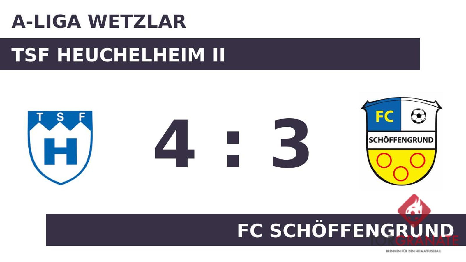 Kaum war das Spiel angepfiffen, lag der FC Schöffengrund bereits in Front. Christian Boettner markierte in der vierten Minute die Führung. Nach nur 24 Minuten verließ Pascal Remus von der TSF Heuchelheim II das Feld, Keno Just kam in die Partie. In der 27. Minute erzielte Florian Lest das 1:1 für die Heimmannschaft. Tony Neumann versenkte den Ball in der 29. Minute im Netz des FC Schöffengrund. Mund abputzen und weitermachen: Unter diesem Motto stand der Ausgleich, den Sebastian Chmura bereits wenig später besorgte (33.). Ehe der Unparteiische Christian Schmidt (Gießen) die Protagonisten zur Pause bat, traf Nico Städele zum 3:2 zugunsten der TSF Heuchelheim II (45.). Die Pausenführung der TSF Heuchelheim II fiel knapp aus. Zum spielentscheidenden Akteur avancierte Sebastian Auriga, der mit seinem Treffer in der 90. Minute die späte Führung der TSF Heuchelheim II sicherstellte. Dominik Rausch war es, der in der 90. Minute das Spielgerät im Gehäuse der TSF Heuchelheim II unterbrachte. Letzten Endes holte die TSF Heuchelheim II gegen den FC Schöffengrund drei Zähler.