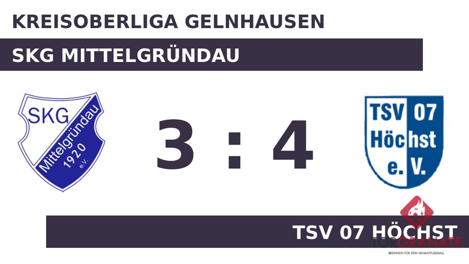Kaum war das Spiel angepfiffen, lagen die Höchster bereits in Front. Janis Häuser markierte in der fünften Minute die Führung. Die SKG Mittelgründau zeigte sich wenig beeindruckt. In der neunten Minute schlug Maximilian Betz mit dem Ausgleich zurück. Felix Engel brachte dem TSV 07 Höchst nach 39 Minuten die 2:1-Führung. Die Gäste hatten zur Pause eine knappe Führung auf dem Zettel stehen. Das 2:2 der SKG Mittelgründau bejubelte Dmitrij Gross (70.). Sieben Minuten später ging der TSV 07 Höchst durch den zweiten Treffer von Häuser in Führung. In der 89. Minute verwandelte Aaron Rostek einen Elfmeter zum 3:3 für die SKG Mittelgründau. Der Schlusspfiff war zum Greifen nah, als Louis Demar noch einen Treffer parat hatte (90.). Am Schluss gewann der TSV 07 Höchst gegen die SKG Mittelgründau.