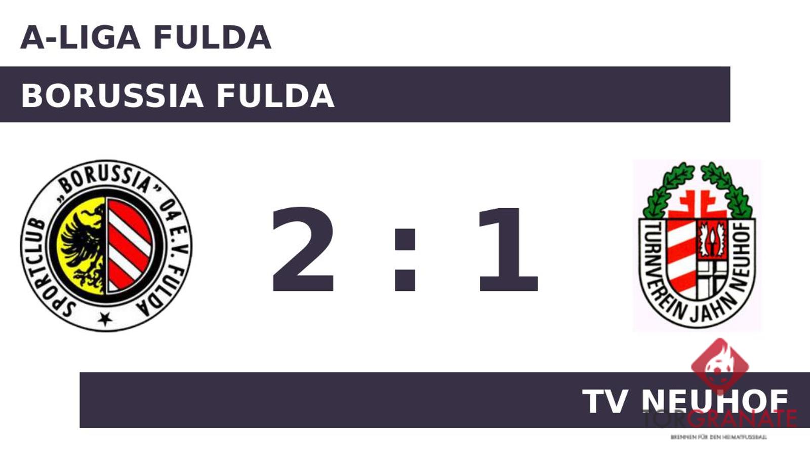 Borussia Fulda ging durch einen Elfmeter von Marko Curic in Führung (21.). Youba Sidibe nutzte die Chance für den SCB und beförderte in der 23. Minute das Leder zum 2:0 ins Netz. Die Hintermannschaft des TV Neuhof ließ bis zur Pause kein weiteres Tor zu und es ging bei unverändertem Stand in die Kabinen. Mehmet Corumlu witterte seine Chance und schoss den Ball zum 1:2 für den TV ein (80.). Schließlich strich Borussia Fulda die Optimalausbeute gegen den Jahn ein.