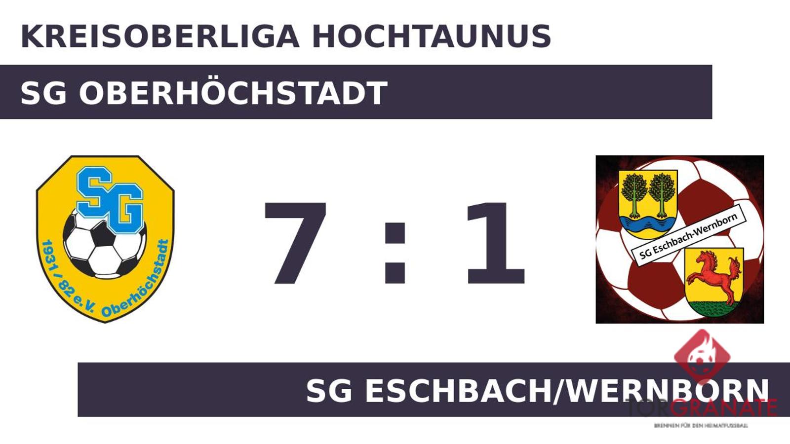 Für den Führungstreffer der SG Oberhöchstadt zeichnete Denis Winter verantwortlich (15.). Ibrahim Birinci schoss die Kugel zum 2:0 für den Gastgeber über die Linie (19.). Ohne weitere Tore ging es in die Pause. Mit dem 3:0 durch Winter schien die Partie bereits in der 47. Minute mit der SG Oberhöchstadt einen sicheren Sieger zu haben. Die SG Oberhöchstadt zeigte auch weiterhin keine Gnade. So schossen Yassin Ennaji (48./63.) und Birinci (49.) drei weitere Treffer. Die SG Eschbach/Wernborn kam kurz vor dem Ende durch Felix Bank zum Ehrentreffer (89.). Ennaji gelang in den Schlussminuten noch ein weiterer Treffer für die SG Oberhöchstadt (90.). Am Ende kam die SG Oberhöchstadt gegen die SG Eschbach/Wernborn zu einem verdienten Sieg.