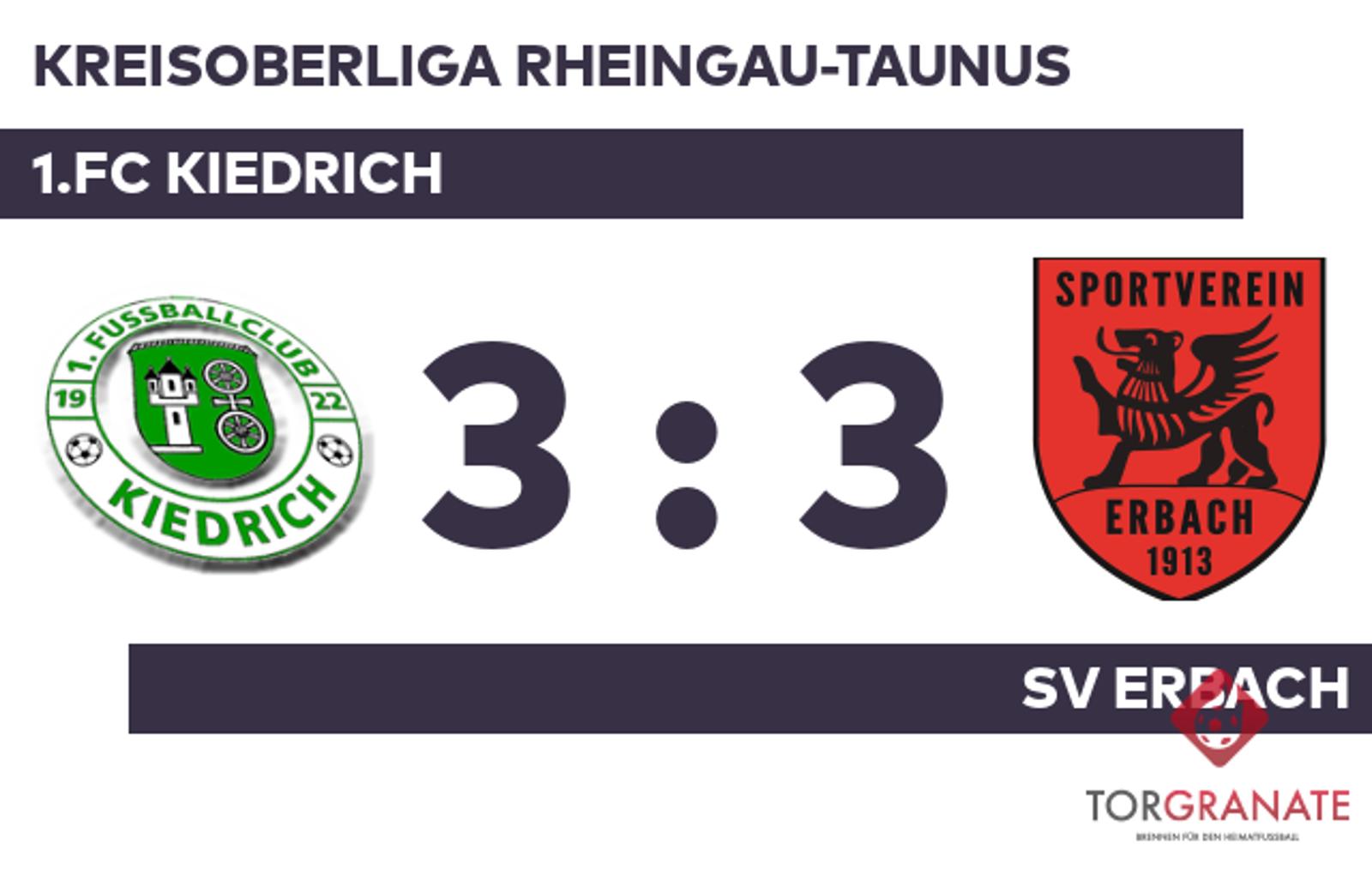 Der SV Erbach geriet schon in der siebten Minute in Rückstand, als Laurenz Rheingans das schnelle 1:0 für den 1.FC Kiedrich erzielte. Wenig später verwandelte Luka Vrbanjac einen Elfmeter zum 1:1 zugunsten des SV Erbach (11.). Davide Grande machte in der 25. Minute das 2:1 des 1.FC Kiedrich perfekt. Noch bevor es in die Halbzeit ging, war Sascha Haack mit dem 3:1 für das Heimteam zur Stelle (43.). Mit der Führung für den 1.FC Kiedrich ging es in die Kabine. Das 2:3 des SV Erbach bejubelte Christian Rustler (77.). In der 79. Minute gelang dem Gast, was zur Pause in weiter Ferne war: der Ausgleichstreffer durch Danis Julevic. Schließlich gingen der 1.FC Kiedrich und der SV Erbach mit einer Punkteteilung auseinander.