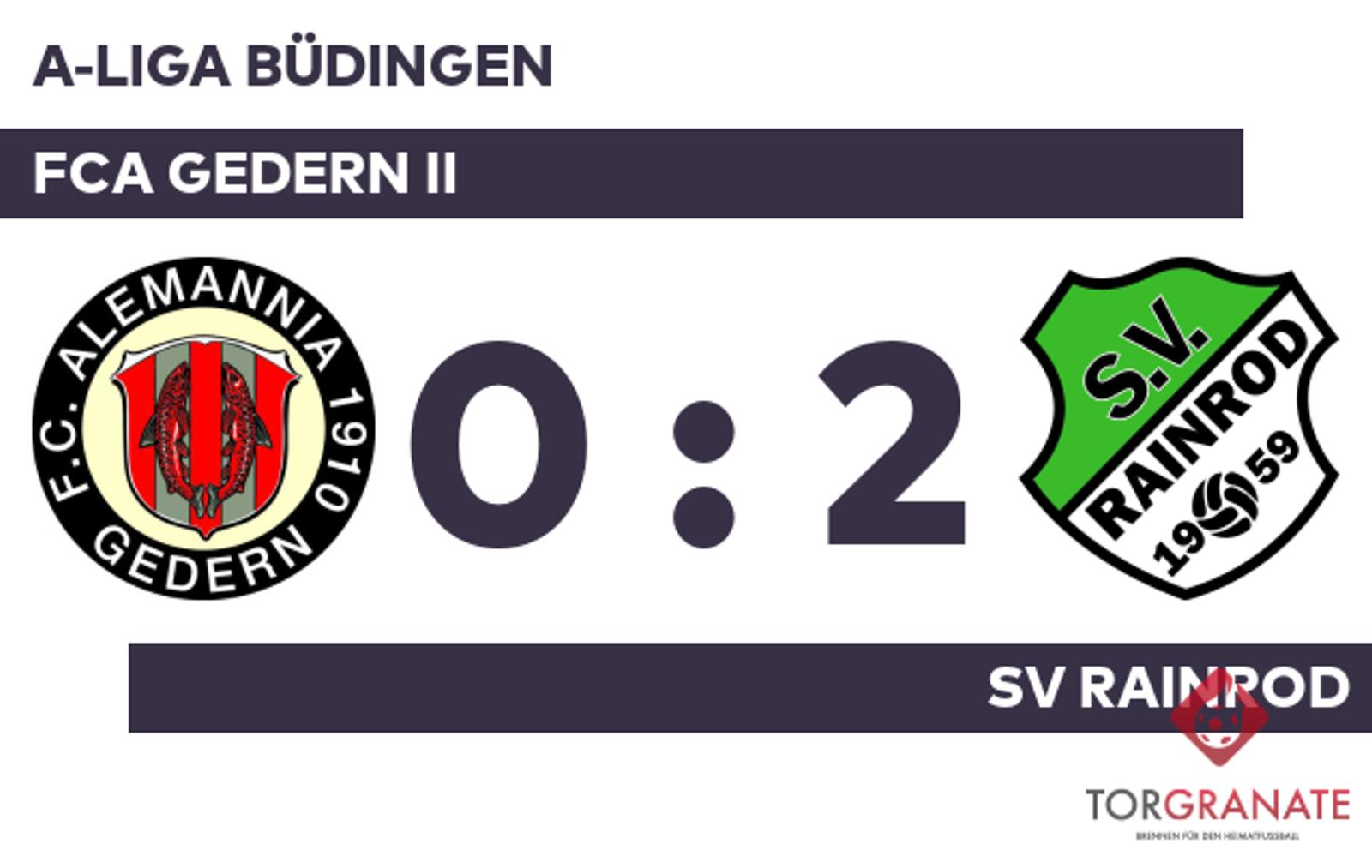Tim Bausch brachte den SV Rainrod in der 32. Minute nach vorn. Die Gäste hatten zur Pause eine knappe Führung auf dem Zettel stehen. Mit einem Wechsel – Philipp Vincent Neumann kam für Raphael-Lucas Reiß – startete der Ligaprimus in Durchgang zwei. Sven Diedrich erhöhte den Vorsprung des SV Rainrod nach 78 Minuten auf 2:0. Alexander Korell (Lauterbach (Hessen)) beendete das Spiel und damit schlug der SV Rainrod den FCA Gedern II auswärts mit 2:0.