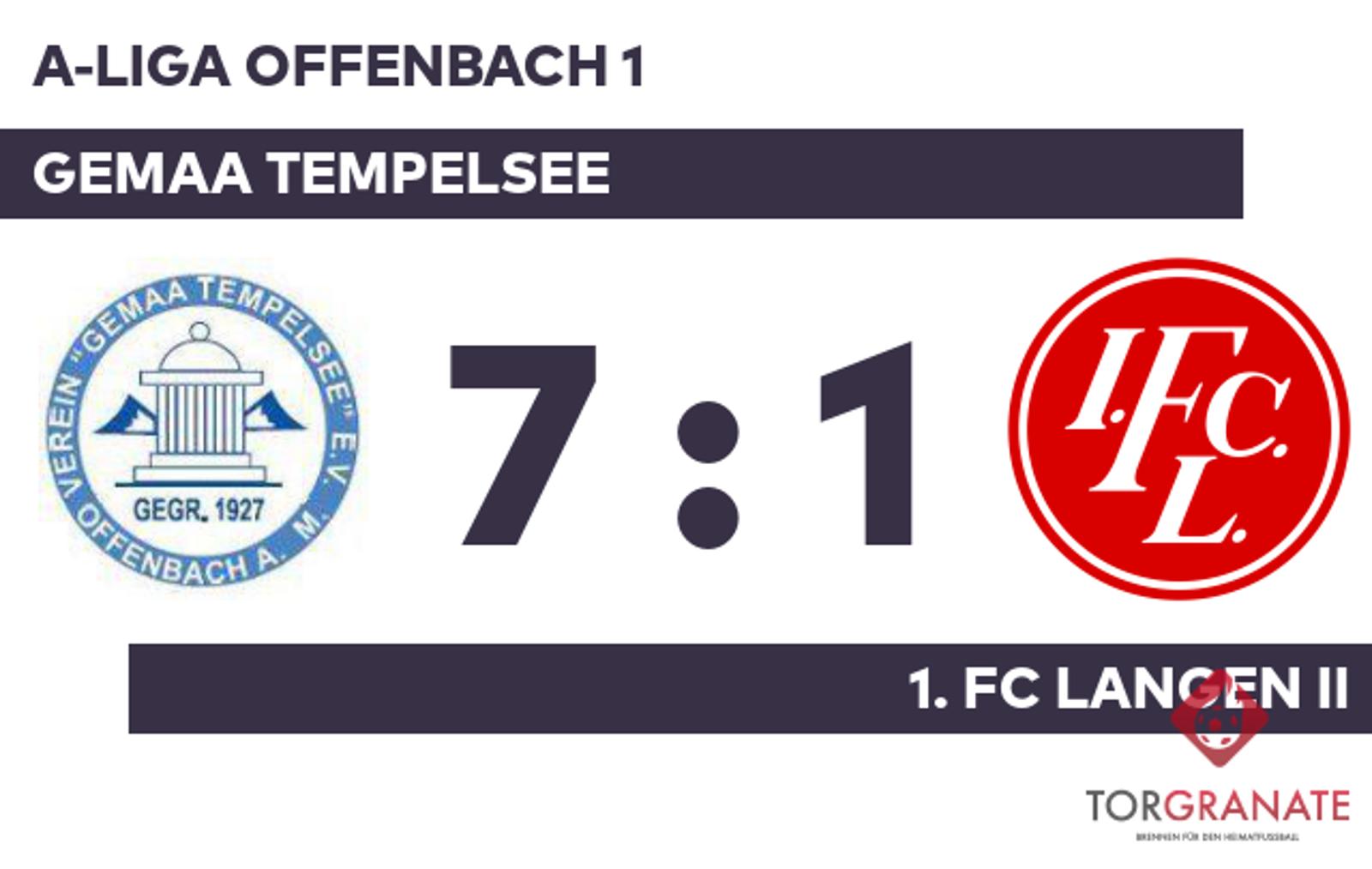 Das Gemaa Tempelsee erwischte einen Blitzstart ins Spiel. Elvedin Lekovic traf in der sechsten Minute zur frühen Führung. Bereits in der 15. Minute erhöhte Khalid Belkasmi den Vorsprung des Gastgebers. Anes Hadzic versenkte den Ball in der 22. Minute im Netz des Gemaa Tempelsee. Der Halbzeitpfiff war noch nicht ertönt, als Lekovic seinen zweiten Treffer nachlegte (44.). Mit der Führung für das Gemaa Tempelsee ging es in die Kabine. Zum Seitenwechsel ersetzte Tom Appelrath vom 1. FC Langen II seinen Teamkameraden Gabriel Weber. Ibrahim Ilhan (51.) und Ismail Yildiz (57.) trafen innerhalb weniger Minuten zur Vorentscheidung des Gemaa Tempelsee. Maximilian Ruhr gelang ein Doppelpack (65./86.), mit dem er das Ergebnis auf 7:1 hochschraubte. Schlussendlich verbuchte das Gemaa Tempelsee gegen den 1. FC Langen II einen überzeugenden Heimerfolg.