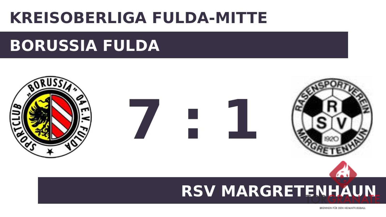 Amer Aljaed brachte den SCB in der 24. Spielminute in Führung. Kurz vor dem Halbzeitpfiff (44.) baute Ahmed Emre Aydogan die Führung des Traditionsverein aus. Mit der Führung für die Borussen ging es in die Kabine. Felix Bug verkürzte für den RSV Margretenhaun später in der 53. Minute auf 1:2. Borussia Fulda baute den Vorsprung mit der Hilfe des Gegners weiter aus: 3:1 für die Fuldaer durch ein Eigentor des RSV Margretenhaun in der 58. Minute. Mit dem 4:1 von Aydogan für Borussia Fulda war das Spiel eigentlich schon entschieden (59.). Dustin Traut schraubte das Ergebnis in der 68. Minute mit dem 6:1 für die Gastgeber in die Höhe. Der siebte Streich von Borussia Fulda war Hennadii Hryhorian vorbehalten (86.). Am Ende kam Borussia Fulda gegen den RSV Margretenhaun zu einem verdienten Sieg.