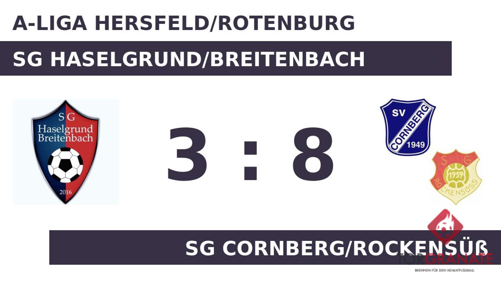 Auf die vermeintliche Siegerstraße brachte Moritz Ritter sein Team in der zwölften Minute. Manuel Toro Moreno schockte die SG Haselgrund/Breitenbach und drehte die Partie mit seinem Doppelpack für Cornberg/Rockensüß (24./32.). Henrik Schlüter schoss für Haselgr./Breitenb. in der 39. Minute das zweite Tor. Vor dem Seitenwechsel sorgte Tobias Bernauer mit seinem Treffer für eine kalte Dusche für die Gastgeber. Mit einem Tor Vorsprung für die SG Cornberg/Rockensüß ging es für die beiden Teams in die Halbzeitpause. In Topform präsentierte sich Marius Franz, der einen lupenreinen Hattrick markierte (51./56./61.) und der SG Haselgrund/Breitenbach einen schweren Schlag versetzte. Jonas Goldbach (78.) und Fabian Franz (81.) brachten Cornberg/Rockensüß mit zwei schnellen Treffern weiter nach vorne. Kurz vor Ultimo war noch Alper Oraltay zur Stelle und zeichnete für das dritte Tor von Haselgr./Breitenb. verantwortlich (85.). Die SG Cornberg/Rockensüß überrannte die SG Haselgrund/Breitenbach förmlich mit acht Toren und fährt so mit einem verdienten Sieg in der Tasche nach Hause.