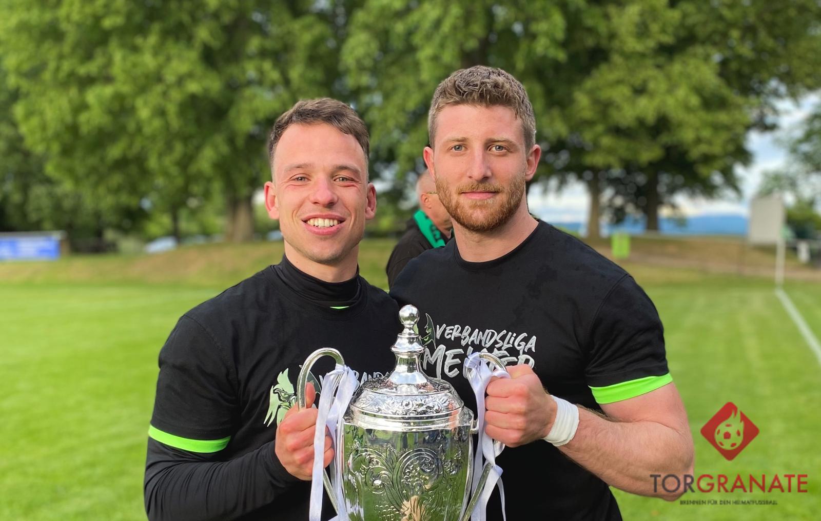 Tim Ullrich (rechts) hat muskeltechnisch ordentlich draufgepackt – und dementsprechend keine Probleme den Meisterpokal mit Jan Gerbig zu stemmen. Foto: privat