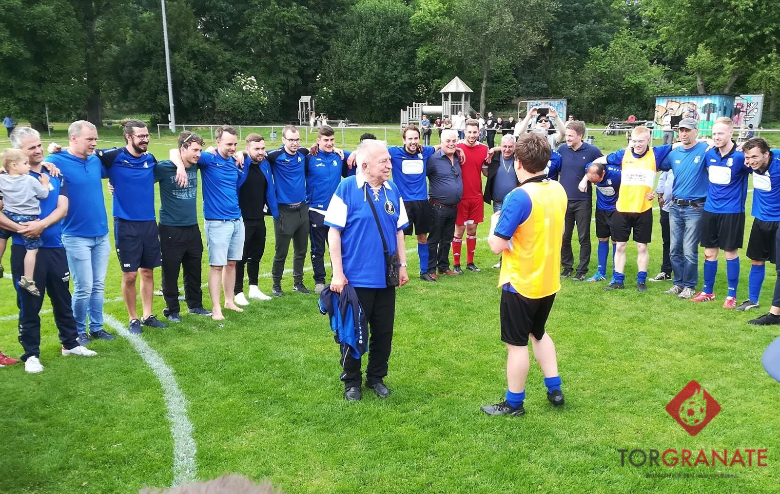 Die SG Bornheim kreiselte nach nach dem perfekt gemachten Aufstieg ihren Ehrenpräsidenten Klaus Schmitt ein. Foto: Christoph Weß