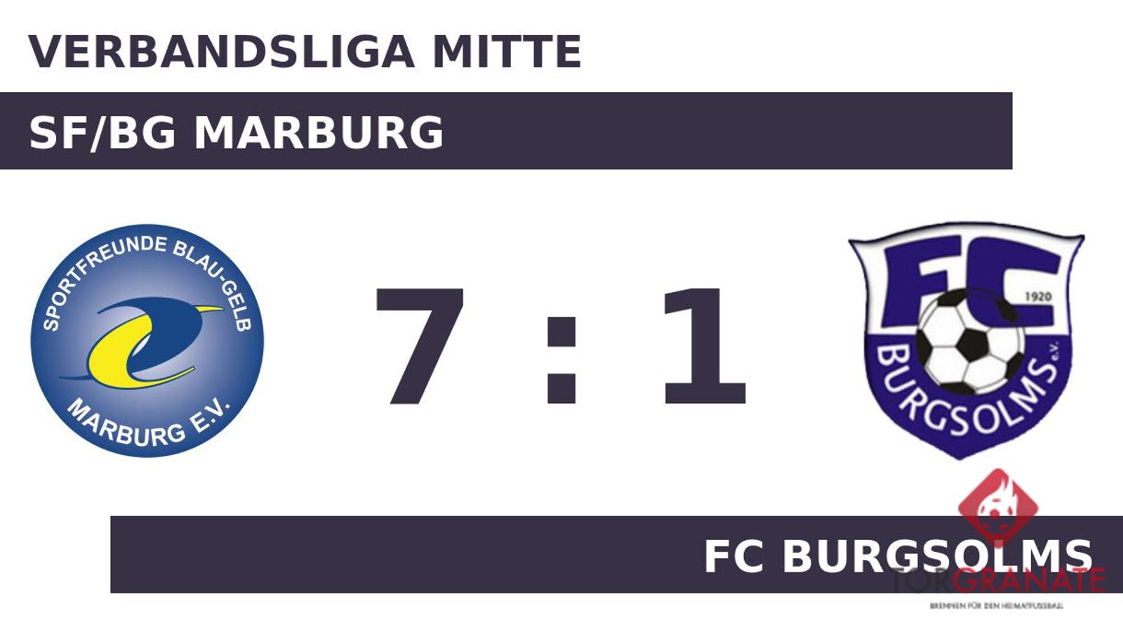 Jason Barth trug sich in der siebten Spielminute in die Torschützenliste ein. Das SF/BG Marburg machte weiter Druck und erhöhte den Spielstand im Eilschritt durch einen Treffer von Clemens Landau (8.). In der 13. Minute erzielte Patrick Schmidt das 1:2 für den FC Burgsolms. Der Halbzeitpfiff war noch nicht ertönt, als Landau seinen zweiten Treffer nachlegte (42.). Mit der Führung für das SF/BG Marburg ging es in die Kabine. Anstelle von Jonas Rücker war nach Wiederbeginn Fabian Milan Propadalo für den FC Burgsolms im Spiel. Dem 4:1 durch Matthias Weißkopf (61.) ließen Landau (77.) und Josia Schneider (84.) weitere Treffer für das SF/BG Marburg folgen. Wenig später kamen Konstantinos Gkampouris und Johannes Gierhardt per Doppelwechsel für Matthias Schmidt und Mohamedenis Khalfaoui auf Seiten des FC Burgsolms ins Match (75.). Ben Parson überwand den gegnerischen Schlussmann zum 7:1 für das SF/BG Marburg (86.). Am Ende kam das SF/BG Marburg gegen den FC Burgsolms zu einem verdienten Sieg.