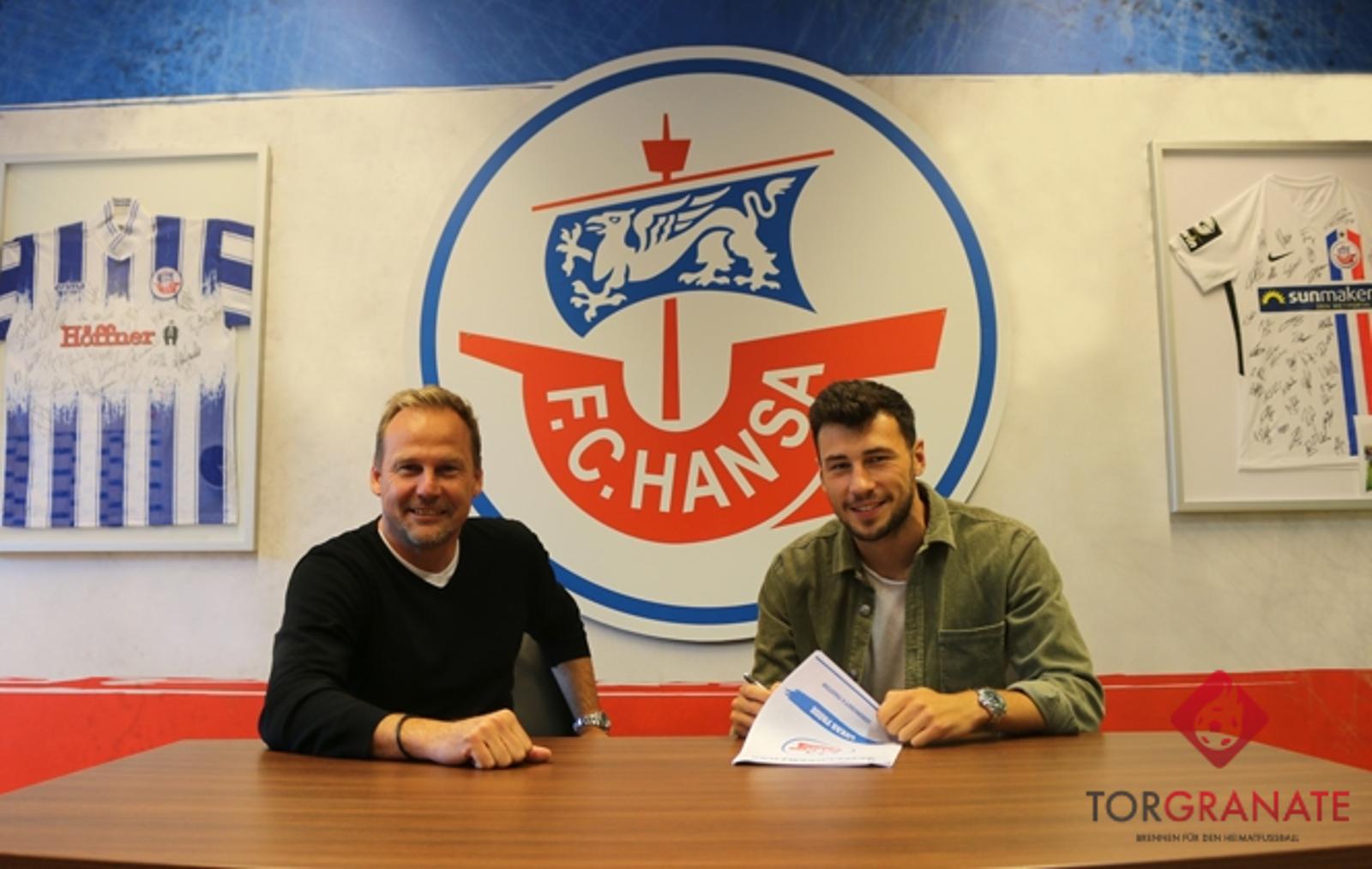 Lukas Fröde (rechts, hier mit Rostocks Sportvorstand Martin Pieckenhagen) verlässt den Karlsruher SC gen Ostseeküste. Foto: FC Hansa Rostock