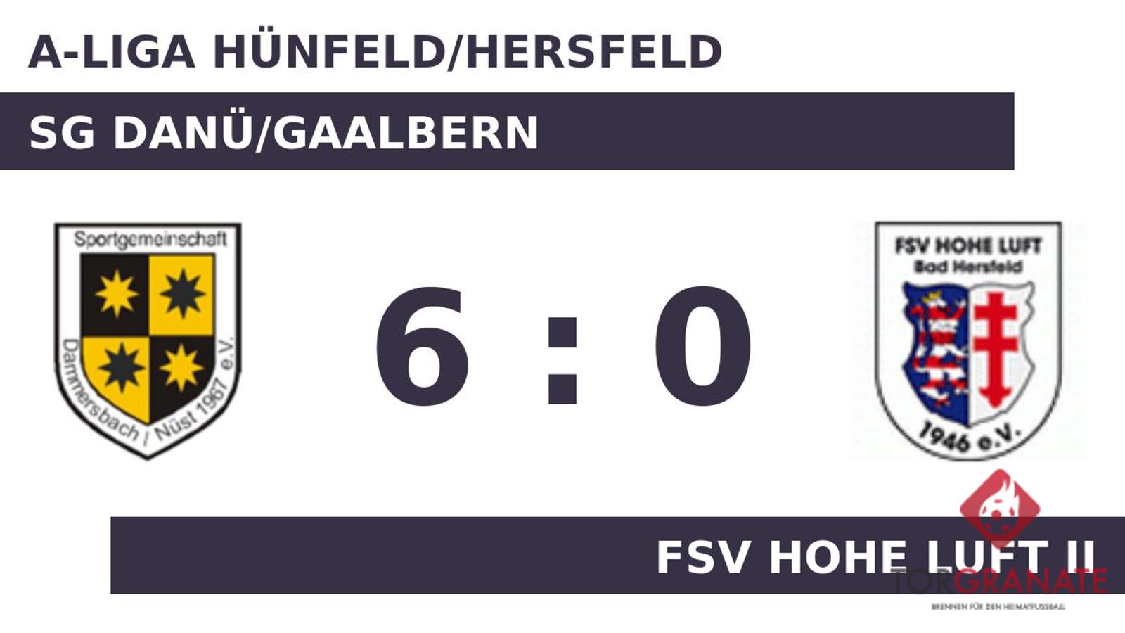 Das 1:0 der SG DaNü/Gaalbern bejubelte Tarmah Bin Iqbal (11.). Andreas Roth versenkte die Kugel zum 2:0 (24.). Mit dem 3:0 von Maximilian Ruschke für die SG DaNü/Gaalbern war das Spiel eigentlich schon entschieden (41.). Die Spielgemeinschaft dominierte den Gegner zur Pause nach Belieben und ging mit einer deutlichen Führung in die Kabine. Der vierte Streich des Heimteams war Michael Kajukin vorbehalten (68.). Das 5:0 für die SG DaNü/Gaalbern stellte Roth sicher. In der 75. Minute traf er zum zweiten Mal während der Partie. Laurin Mörmel stellte schließlich in der 88. Minute den 6:0-Sieg für die SG DaNü/Gaalbern sicher. Schließlich sprang für die SG DaNü/Gaalbern gegen die Zweitvertretung des FSV Hohe Luft ein Dreier heraus.
