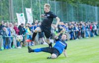 Vollen Einsatz und rassige Zweikämpfe gab es im Derby zwischen der SG Mottgers/Schwarzenfels (blau) und der SG Sterbfritz/Sannerz (schwarz). © Oliver Mueller