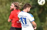 Bronnzells Marian Weber (links) im Kopfballduell mit Fliedens Kapitän Sascha Rumpeltes. Foto: Charlie Rolff