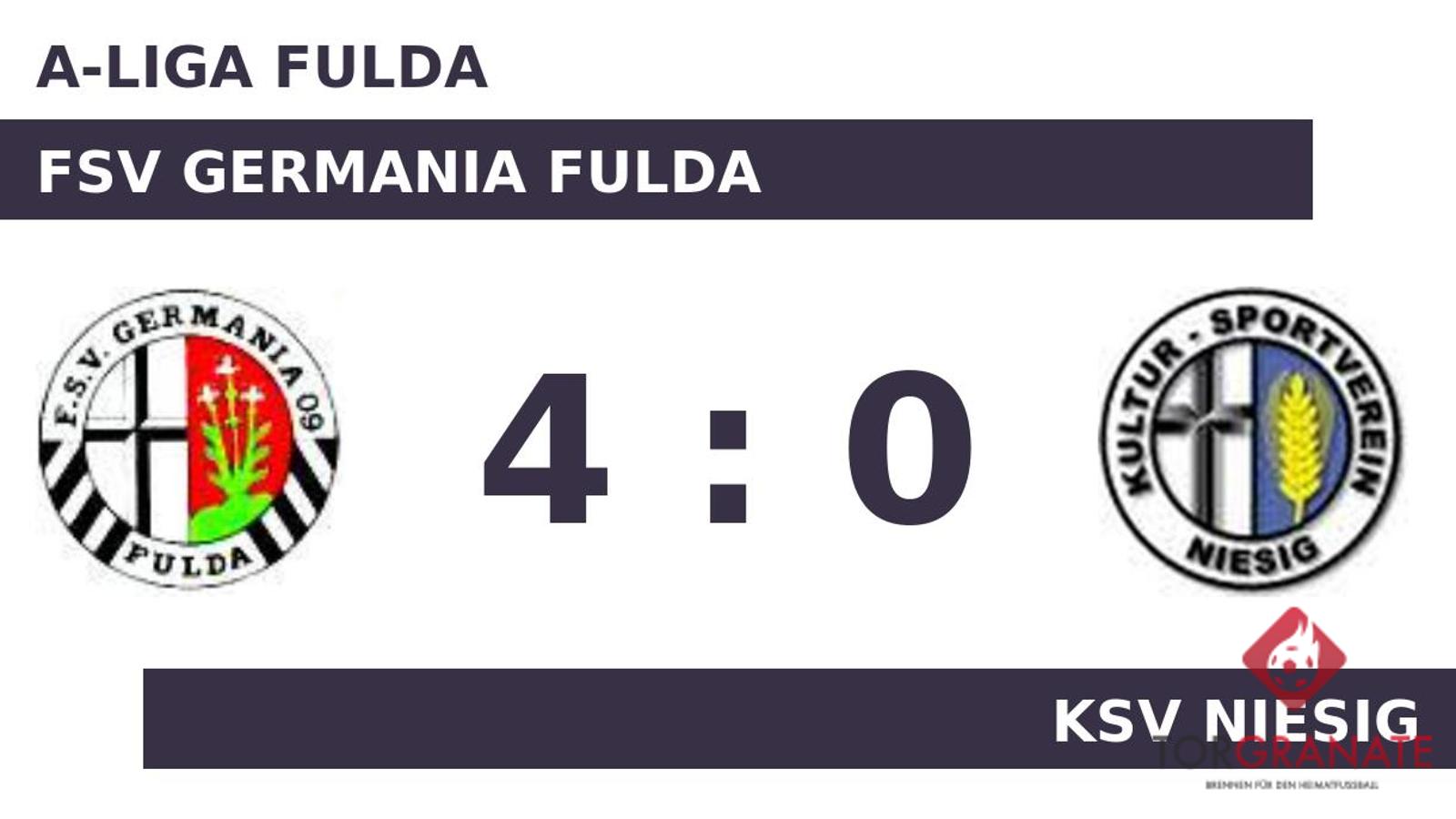 Der KSV Niesig geriet schon in der achten Minute in Rückstand, als Arlind Morina das schnelle 1:0 für Germania Fulda erzielte. Nach nur 30 Minuten verließ Kristoffer Bech vom KSV Niesig das Feld, Martin Martens kam in die Partie. Shpend Brovina nutzte die Chance für den FSV Germania Fulda und beförderte in der 37. Minute das Leder zum 2:0 ins Netz. Mit der Führung für die Germania ging es in die Halbzeitpause. Mit dem 3:0 durch Ege Karadavut schien die Partie bereits in der 55. Minute mit dem FSV einen sicheren Sieger zu haben. Die Fuldaer bauten den Vorsprung mit der Hilfe des Gegners weiter aus: 4:0 für den Gastgeber durch ein Eigentor des KSV Niesig in der 58. Minute. Letztlich feierte Germania Fulda gegen den KSV Niesig nach einer überzeugenden Darbietung einen verdienten 4:0-Heimsieg.