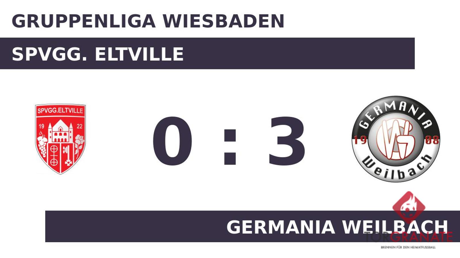 Für das erste Tor sorgte Paul Schmutzler. In der 21. Minute traf der Spieler des Gasts ins Schwarze. Einen Torerfolg in Halbzeit eins verbuchte lediglich die Germania Weilbach, womit man eine knappe Führung mit in die Kabinen nahm. In Durchgang zwei lief Vin Fachinger anstelle von Marc Martin Lopez für die Spvgg. Eltville auf. Pierre Alusse glänzte an diesem Tag besonders. Er traf im Doppelpack für die Germania Weilbach (59./80.). Letztlich hat die Spvgg. Eltville den Befreiungsschlag klar verpasst. Gegen den direkten Widersacher um den Klassenverbleib, die Germania Weilbach, bekam man das Fell über die Ohren gezogen.