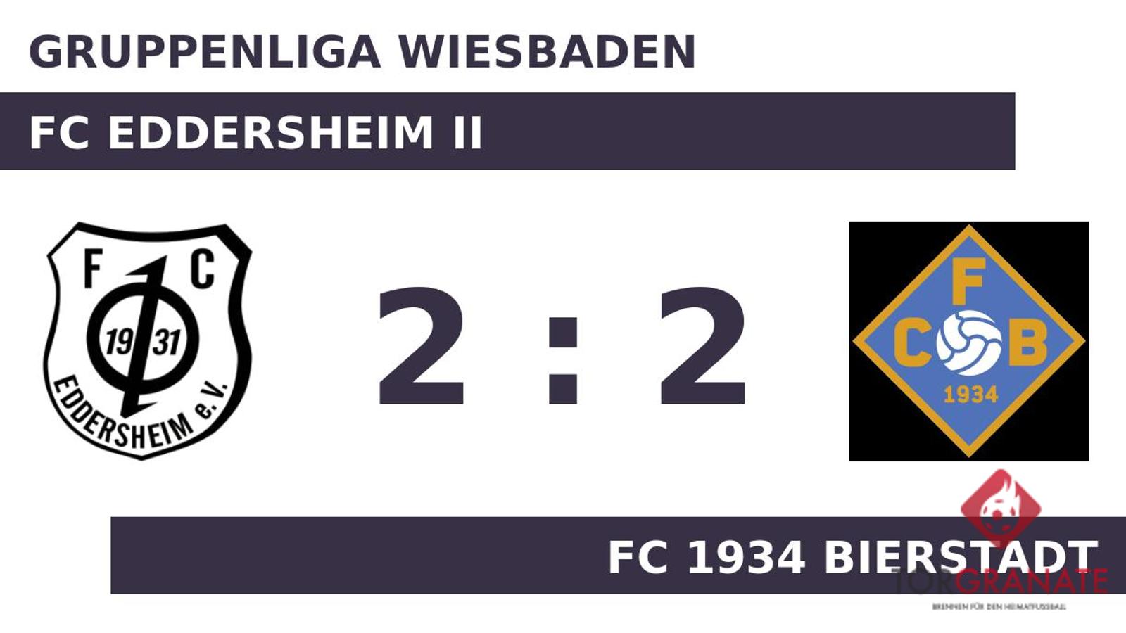 Auf die vermeintliche Siegerstraße brachte Paul Götz sein Team in der 20. Minute. Weitere Tore gab es bis zum Pausenpfiff nicht und so ging es mit der Führung des FC 1934 Bierstadt in die Kabine. Für das erste Tor des FC Eddersheim II war Yusuke Kondo verantwortlich, der in der 54. Minute das 1:1 besorgte. Gavin Schneider, der von der Bank für Lucas Keutmann kam, sollte für neue Impulse beim FC 1934 Bierstadt sorgen (64.). Jason Ptak beförderte das Leder zum 2:1 des FC Eddersheim II in die Maschen (81.). Die Antwort ließ nicht lange auf sich warten. Wenige Augenblicke später besorgte Schneider den Ausgleich (87.). Am Ende stand ein Teilerfolg für beide Mannschaften. Der FC Eddersheim II und der FC 1934 Bierstadt spielten unentschieden.