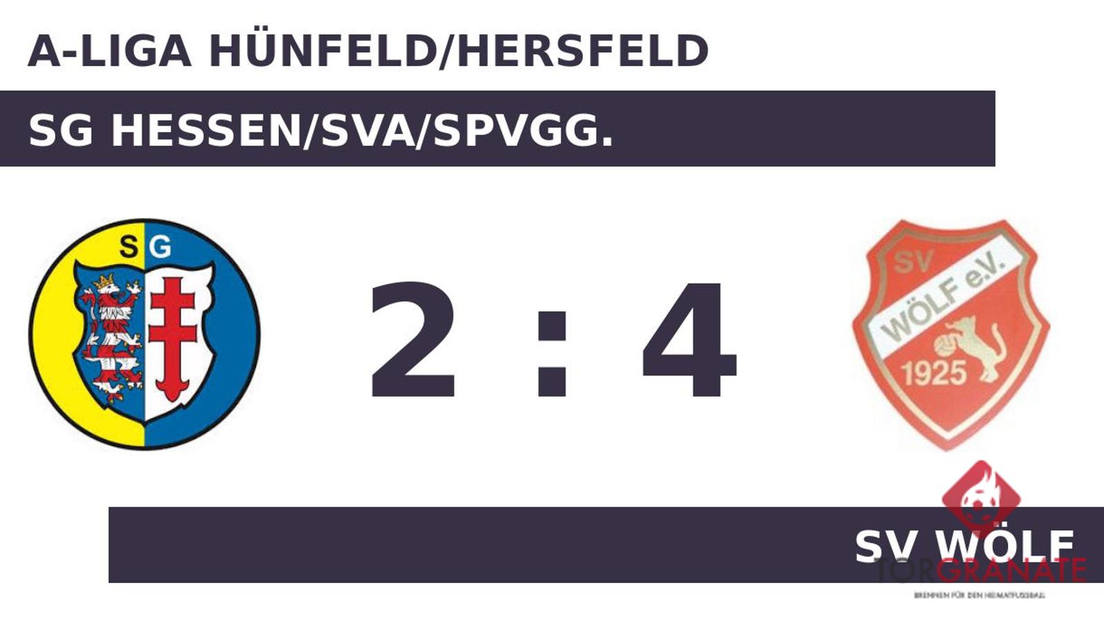 Kaum war das Spiel angepfiffen, lag die SG Hessen/SVA/Spvgg. bereits in Front. Mehmet Yigit markierte in der zweiten Minute die Führung. Marko Madzar nutzte die Chance für den SV Wölf und beförderte in der zwölften Minute das Leder zum 1:1 ins Netz. Bis zum Pausenpfiff blieb der Stand unverändert. Bastian Wiegand stellte die Weichen für den SV Wölf auf Sieg, als er in Minute 48 mit dem 2:1 zur Stelle war. Madzar beseitigte mit seinen Toren (60./73.) die letzten Zweifel am Sieg des rot-weißes Wolfsrudel. Willibroad Gumuh schoss die Kugel zum 2:4 für die SG Hessen/SVA/Spvgg. über die Linie (89.). Schließlich sprang für den SV Wölf gegen die SG Hessen/SVA/Spvgg. ein Dreier heraus.