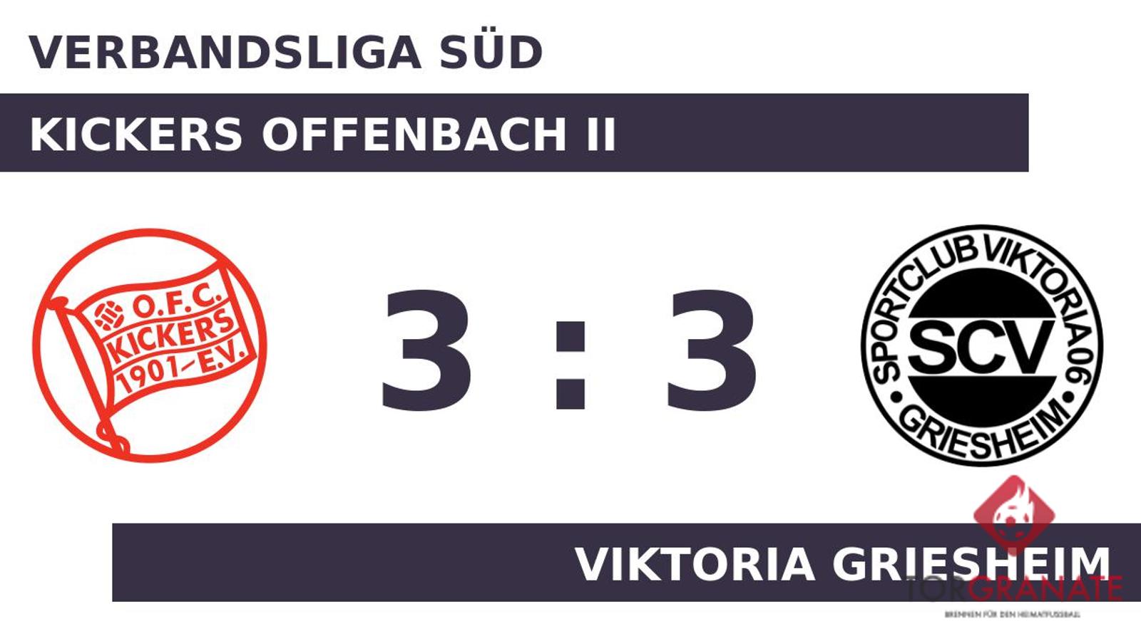 Für das erste Tor sorgte Luca Horst. In der elften Minute traf der Spieler der Kickers Offenbach II ins Schwarze. Zur Pause reklamierte der Gastgeber eine knappe Führung für sich. In der Pause stellte der Viktoria Griesheim personell um: Per Doppelwechsel kamen Gioele Fiandaca und Konstantin Marko Petrovic auf den Platz und ersetzten Enes Arslan und Eleazer Mensah. In der 62. Minute brachte k. A. das Netz für die Kickers Offenbach II zum Zappeln. Ali Kazimi witterte seine Chance und schoss den Ball zum 1:2 für den SC Viktoria 06 ein (64.). Ertrugrul Erdogan glich nur wenig später für den Gast aus (68.). Fiandaca brachte dem Viktoria Griesheim nach 70 Minuten die 3:2-Führung. In der 78. Minute sicherte Horst seiner Mannschaft mit dem Ausgleich zum 3:3 das Unentschieden. Damit schoss er bereits seinen zweiten Treffer. Letztlich trennten sich die Kickers Offenbach II und der SC Viktoria 06 remis.